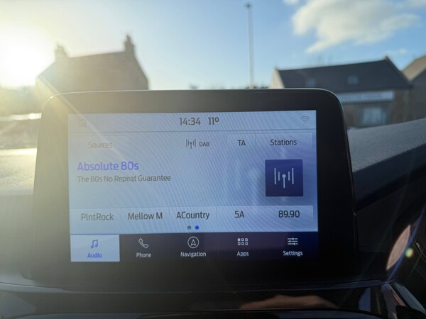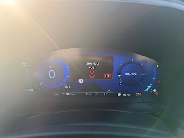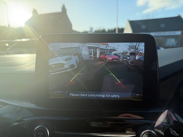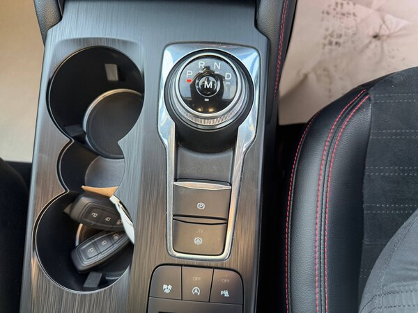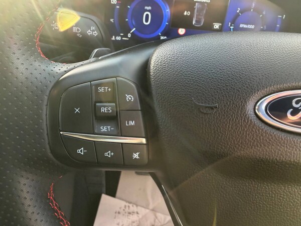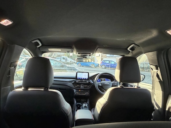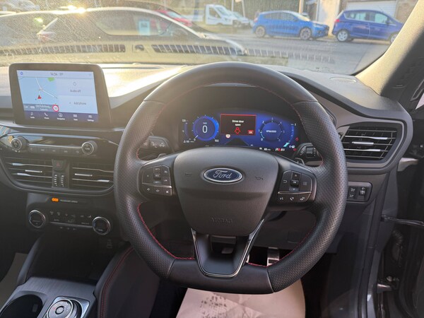 3x3 point rear seatbelts, Airbags - front driver/passenger, front and rear curtain, Drivers knee airbag, Electronic stability control (ESC) and ABS, Ford MyKey Gen 2 safety system, Post collision braking, Powered child proof rear door locks, Pre collision assist with autonomous emergency braking, Red brake calipers, Tyre pressure monitoring system, Cruise control with adjustable speed limiter, Driver impairment monitor, Ford easy fuel, Ford SYNC 3 with 8 inch colour touchscreen, App Link, andriod auto/apple carPlay and navigation with Ford pass connect, Front and rear parking sensors, Intelligent speed assist, Lane keeping aid with lane departure warning, Mobile phone wireless charging pad, Power assist steering, Selectable drive modes, Auto dimming rear view mirror, Auto headlamps with high and low beam, Auto wipers, Black roof rails, Front LED fog lights with cornering function, Full LED headlamps, Large rear spoiler, LED daytime running lights, LED rear lights, Power folding heated door mirrors with puddle lights, Power front/rear windows with global close, Privacy glass, Quickclear heated windscreen, Solid paint, ST Line body styling kit with unique front and rear fascia and bumper, rear painted diffuser, front painted skid plates, dark mesh upper grille, ST Line front scuff plates, Twin exhausts, 2nd row sliding seats, 8 way manual driver seat including lumbar support and height adjust, 8 way manual passenger seat including lumbar support and height adjust, Alloy pedals, Ambient lighting, Centre console with electronic parking brake, Dark headlining and pillars, Dual electronic automatic temperature control, Flat bottomed leather steering wheel in sensico with red stitching, Front and rear head restraints, Rear charging point, Sensico partial premium leather upholstery, Sports seats, ST Line front and rear floor mats, Steering wheel mounted paddle shift, BandO with large instrument cluster pack - Kuga, Engine immobiliser, Keyless entry, Keyless start with 'Ford Power' starter button, Locking wheel nuts, Remote powered central double locking doors, Thatcham category 1 alarm, 18 inch 10 spoke rock metallic alloy wheels, Tyre inflation kit