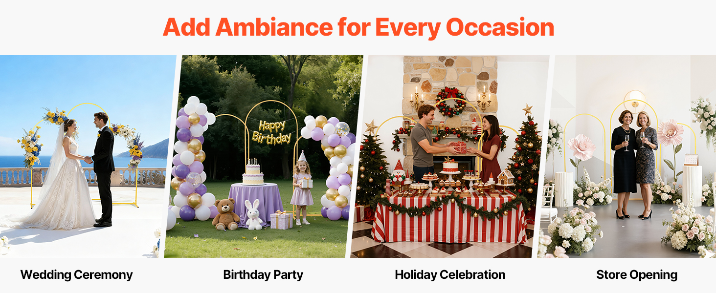 Questo sistema di supporto per fondale ad arco, composto da tre sezioni, è semplice da assemblare. Realizzato con una struttura in metallo resistente, offre solidità e lunga durata. Perfetto per eventi sia al chiuso che all'aperto, aiuta a creare un ambiente accogliente e suggestivo con facilità.