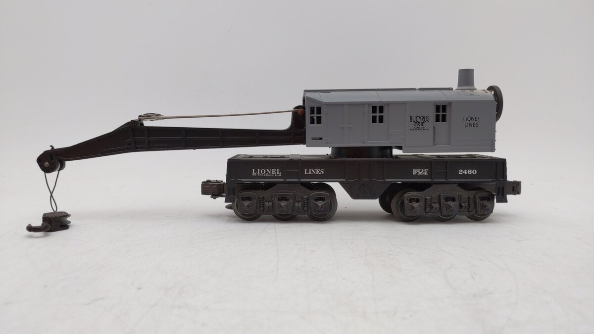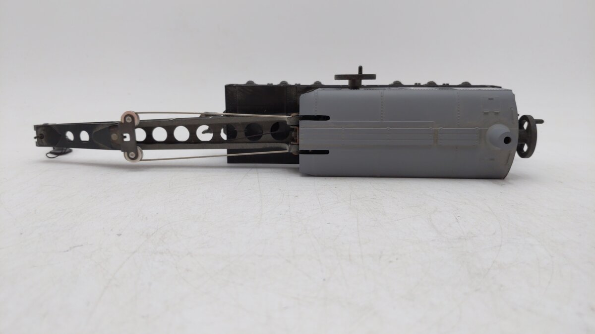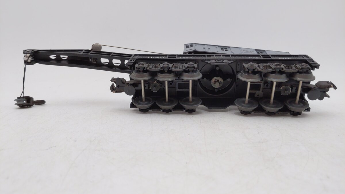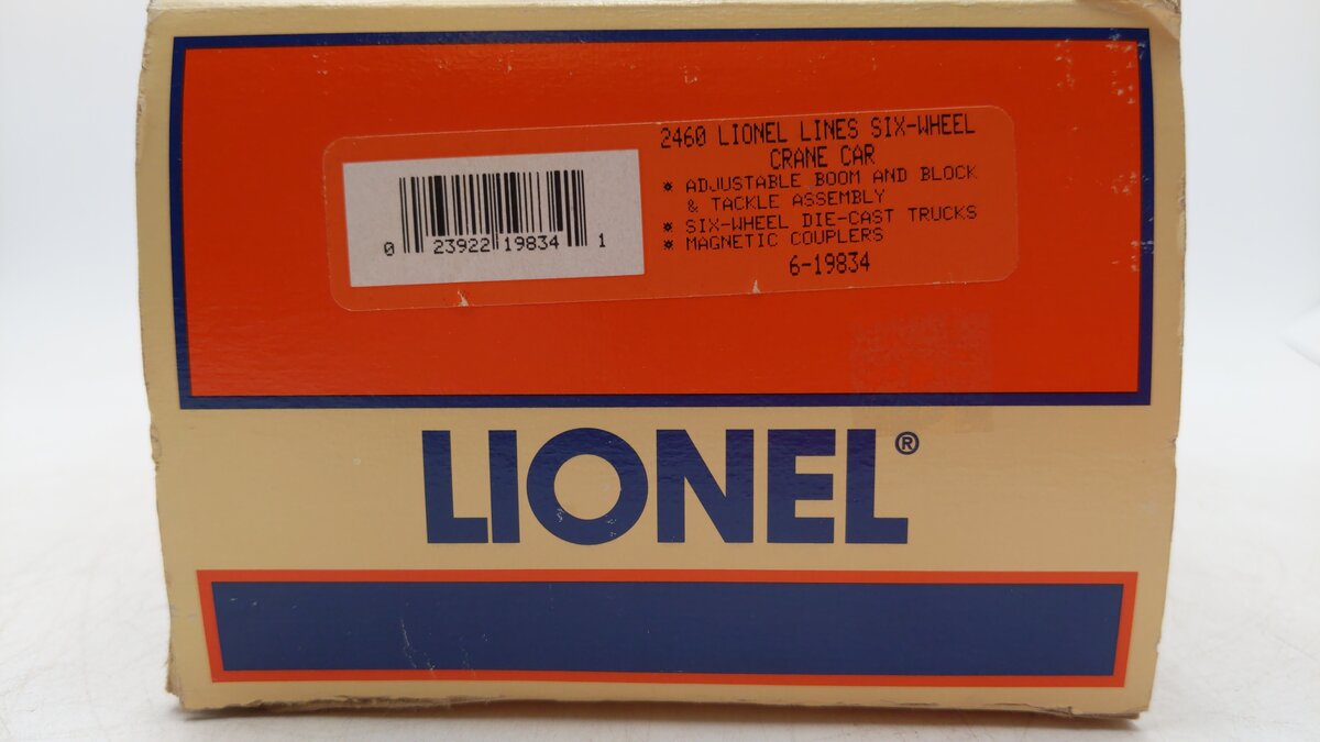 This is a Lionel 6-19834 O Gauge Lionel Lines 6-Wheel Crane Car from 1997. This crane car features die-cast metal trucks, the cab swivels 360 degrees, die-cast metal operating knuckle couplers, metal wheels and axles.