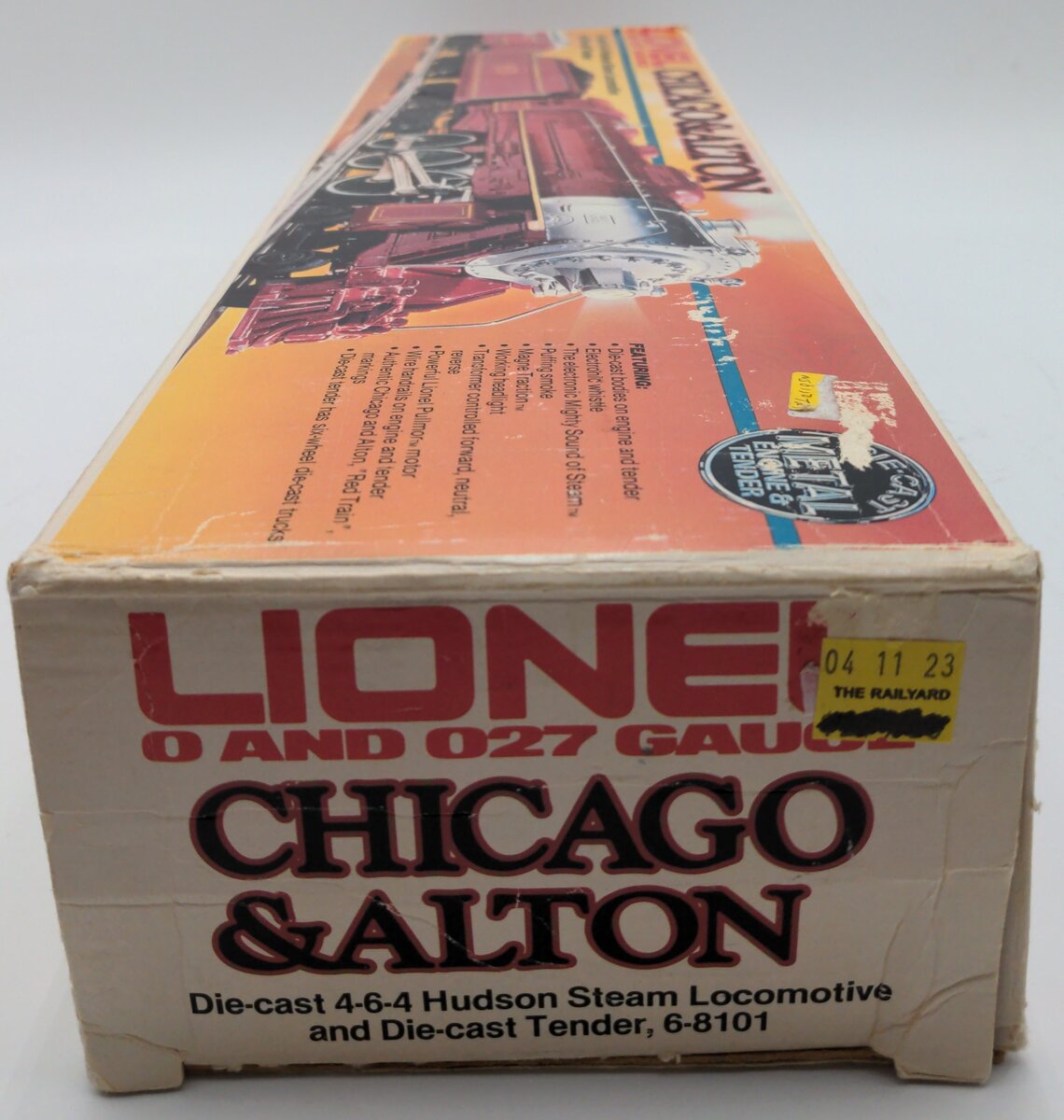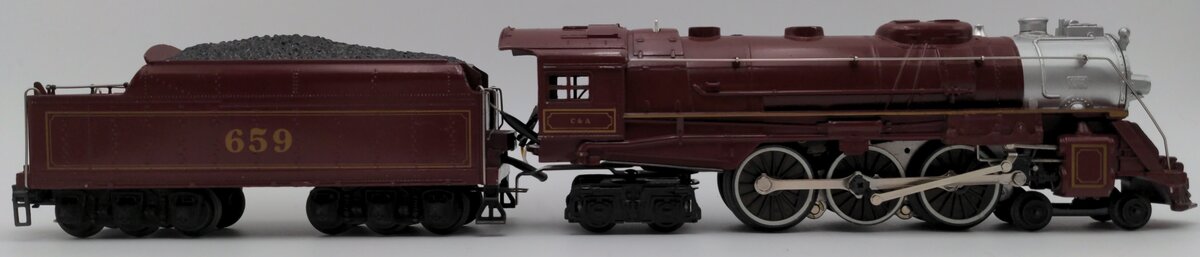 Here is a Lionel 6-8101 O Gauge Chicago & Alton 4-6-4 Steam Locomotive & Tender #659. This engine headed up the Alton Limited Red Train set from that year. Its features include a die-cast boiler, an open frame motor, Magnetraction, an operating smoke unit, an operating headlight, electronic whistle and Sound of Steam, and a great paint scheme.