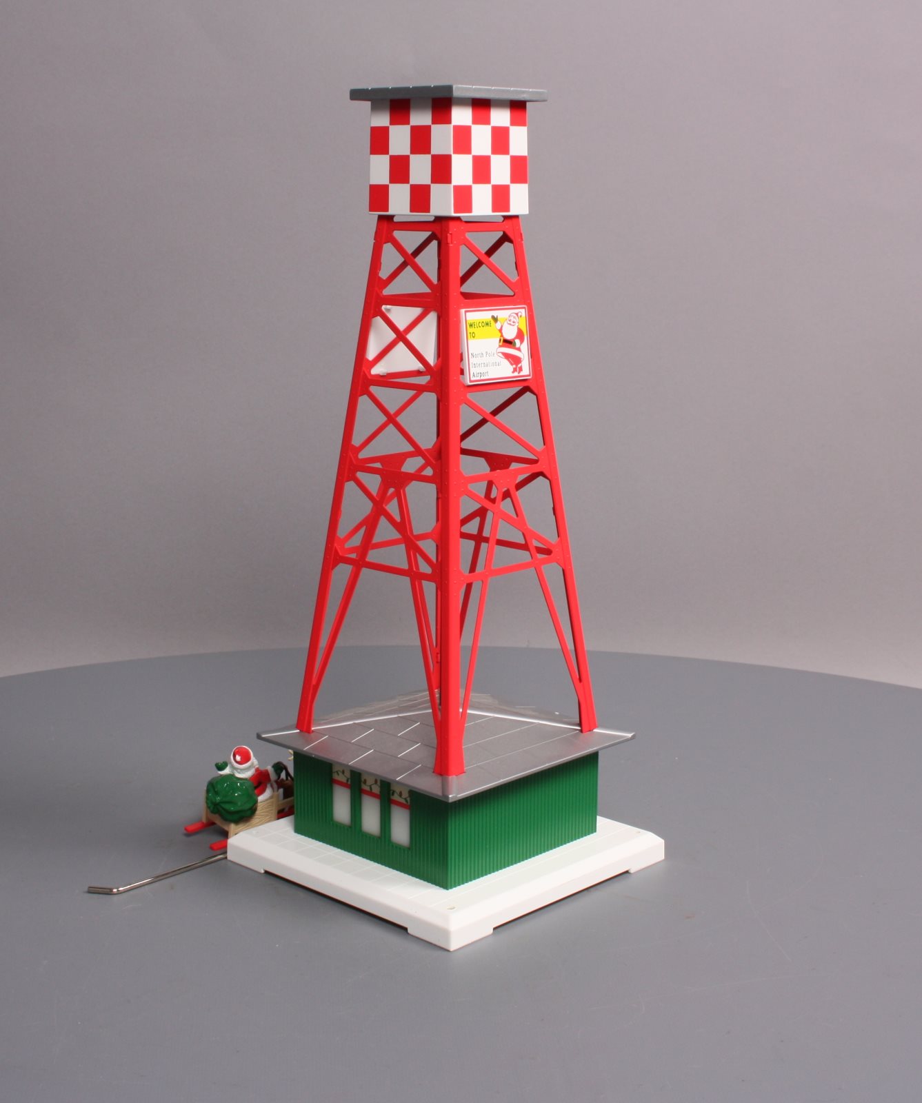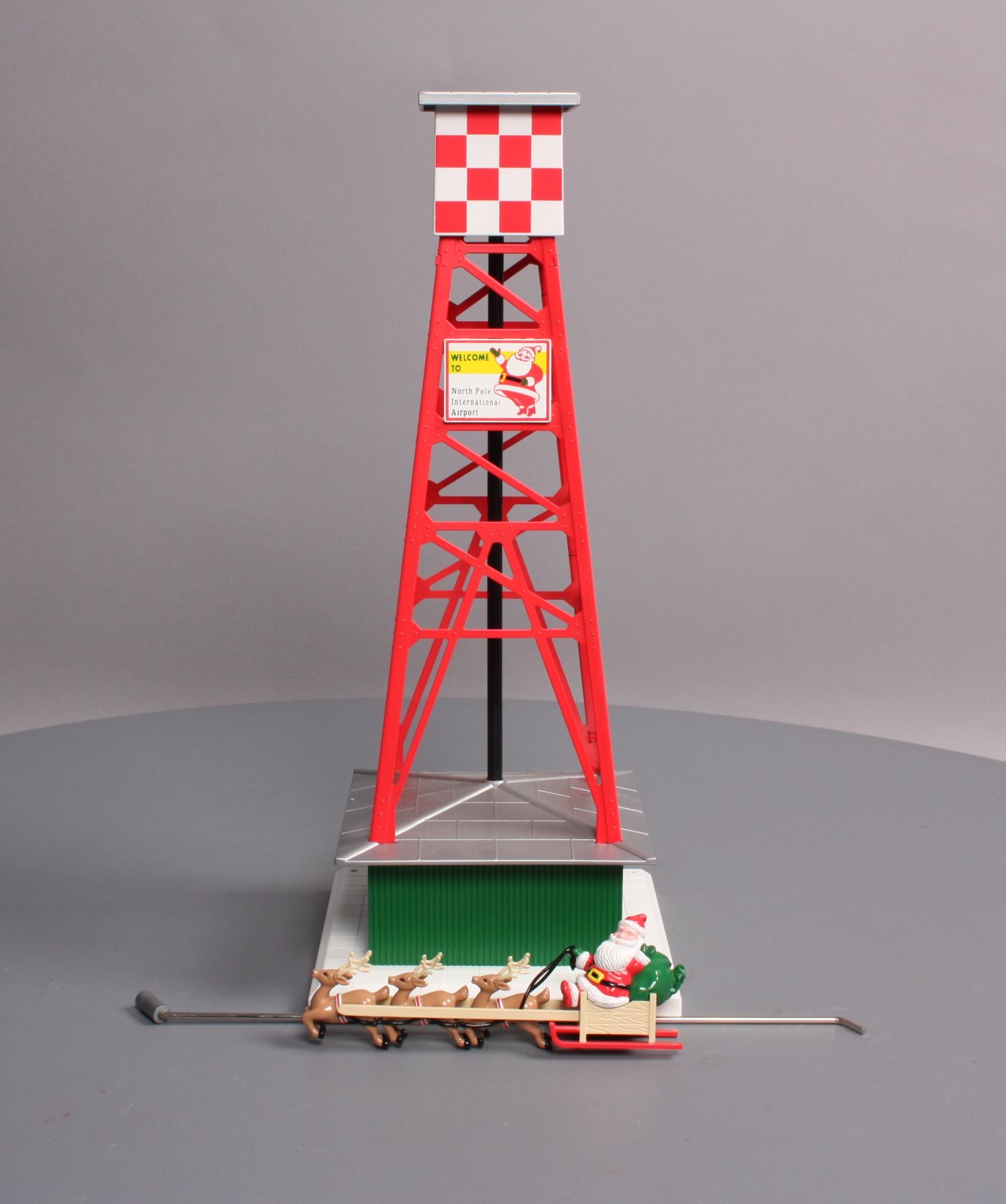 It features a stamped metal tower, detailed molded building, base and tower cab, Santa's sleigh and reindeer that attach to the metal arm and fly around the tower, interior illumination in the building, and it is powered by a precision can motor. Santa and the reindeer fly 21 1/2 inches above base. The dimensions are 5 3/4 inches x 5 3/4 inches x 14 1/4 inches.