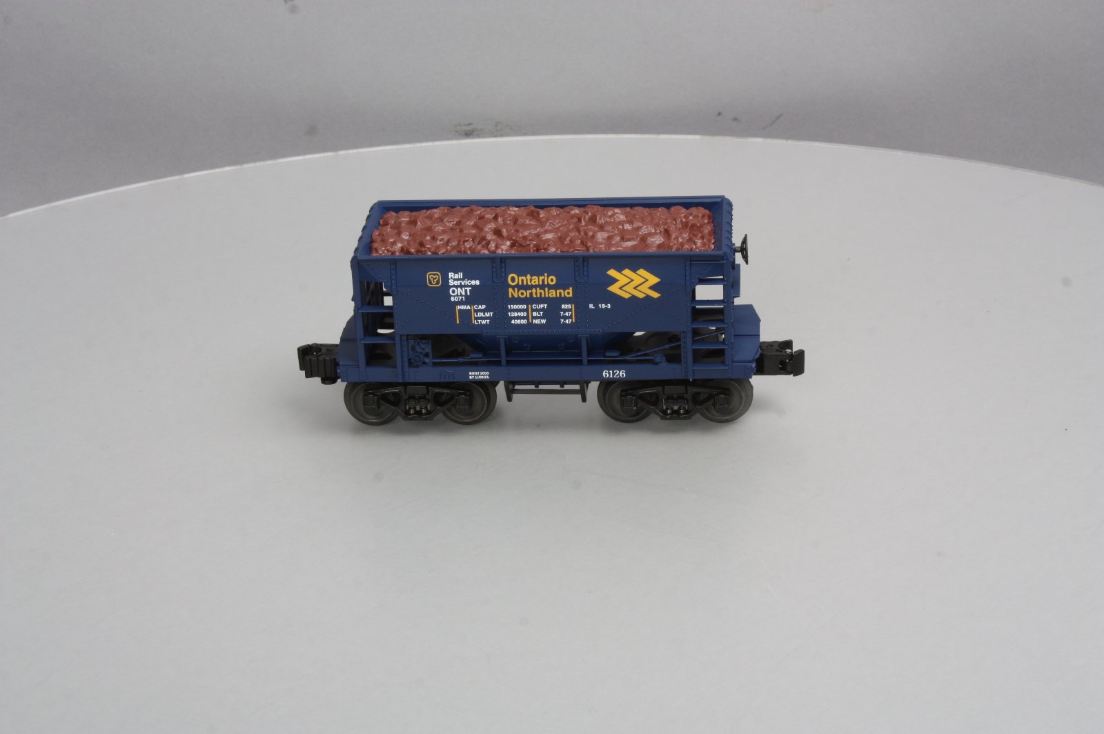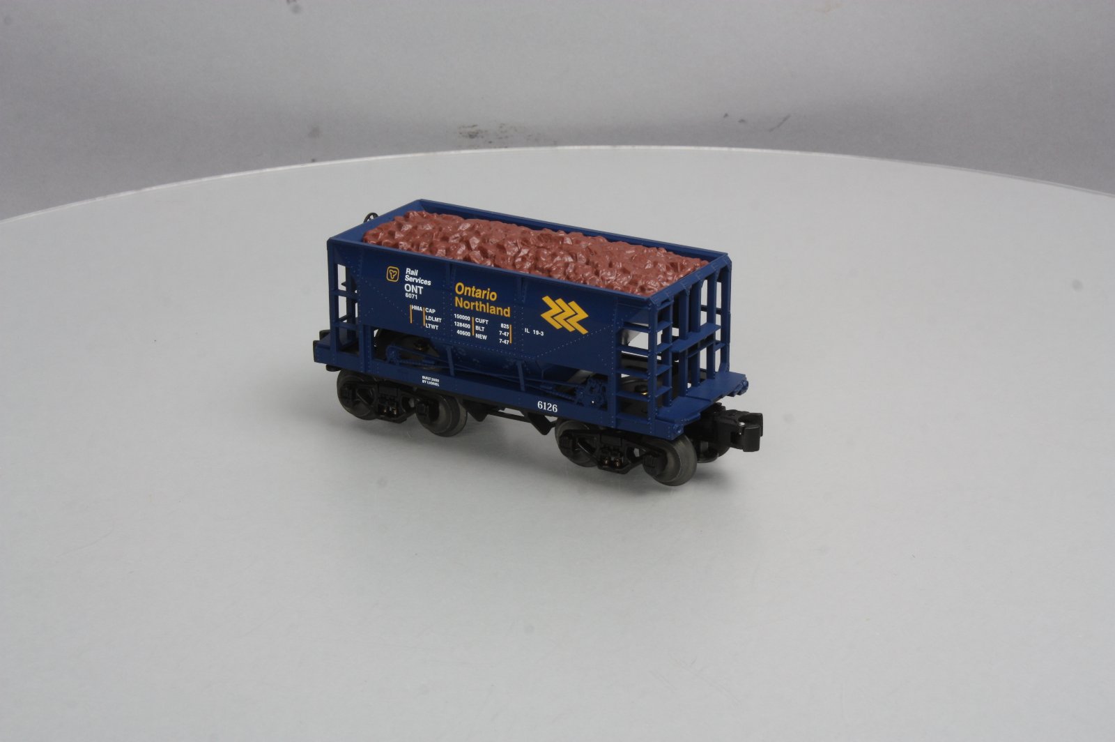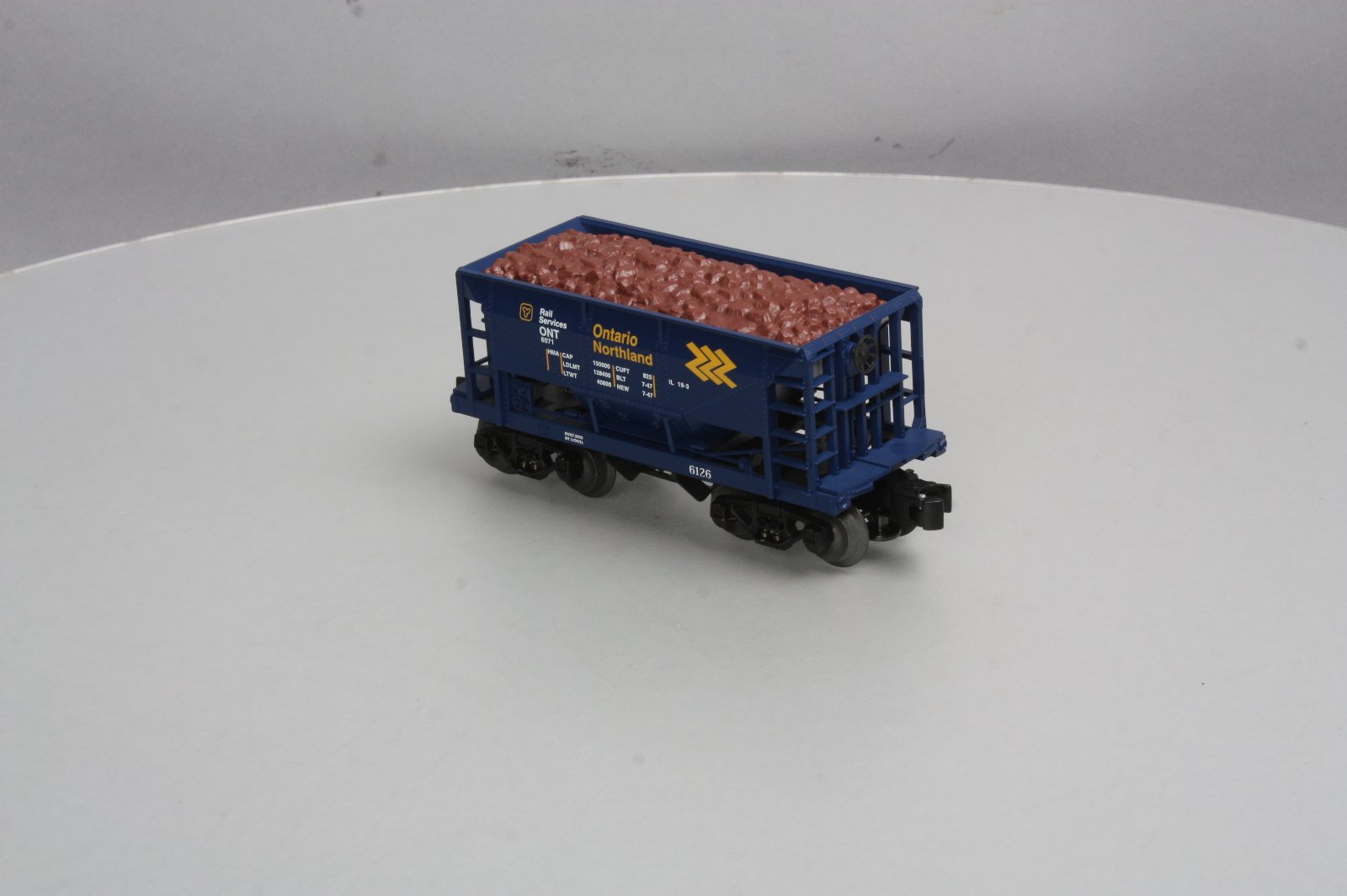 Here is a Lionel 6-17800 O Gauge Ontario Northland Ore Car #6126 w/Ore Load. This car features a detailed molded body, detailed molded frame and ore load, die-cast metal sprung trucks, die-cast metal operating knuckle couplers, metal wheels and axles.