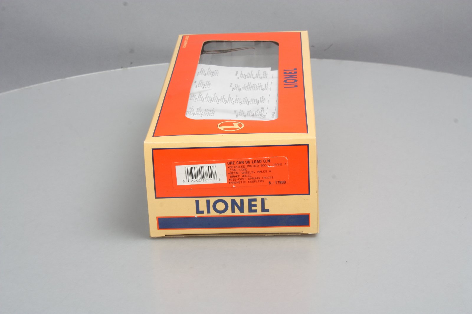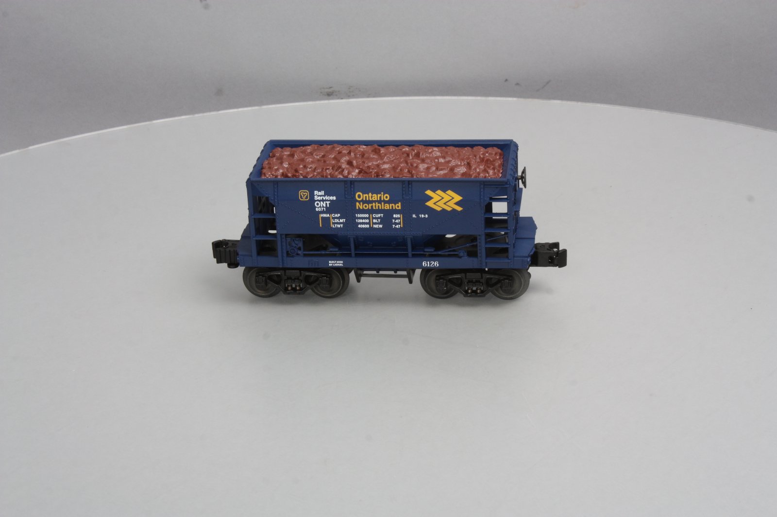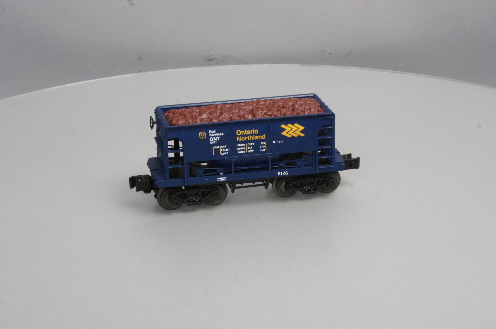 Here is a Lionel 6-17800 O Gauge Ontario Northland Ore Car #6126 w/Ore Load. This car features a detailed molded body, detailed molded frame and ore load, die-cast metal sprung trucks, die-cast metal operating knuckle couplers, metal wheels and axles.