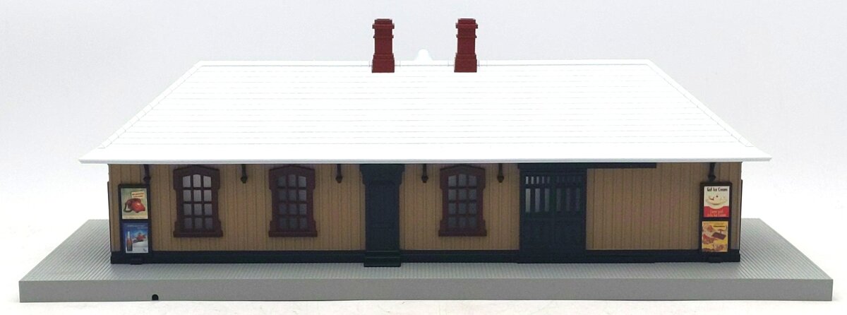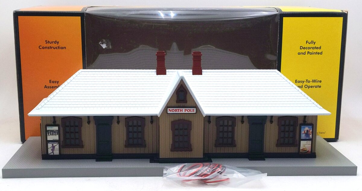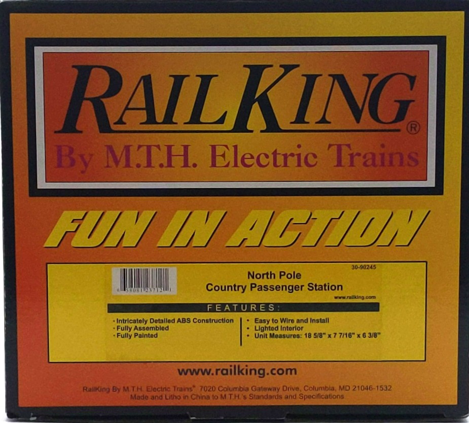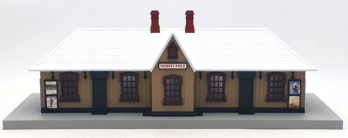 Here is an MTH 30-90245 North Pole Country Pass Station. This passenger station features a sturdy construction, fully decorated and painted, easy to wire and operate, interior lighting, easy assembly and measures 18 5/8' x 7 3/8' x 6 5/8.