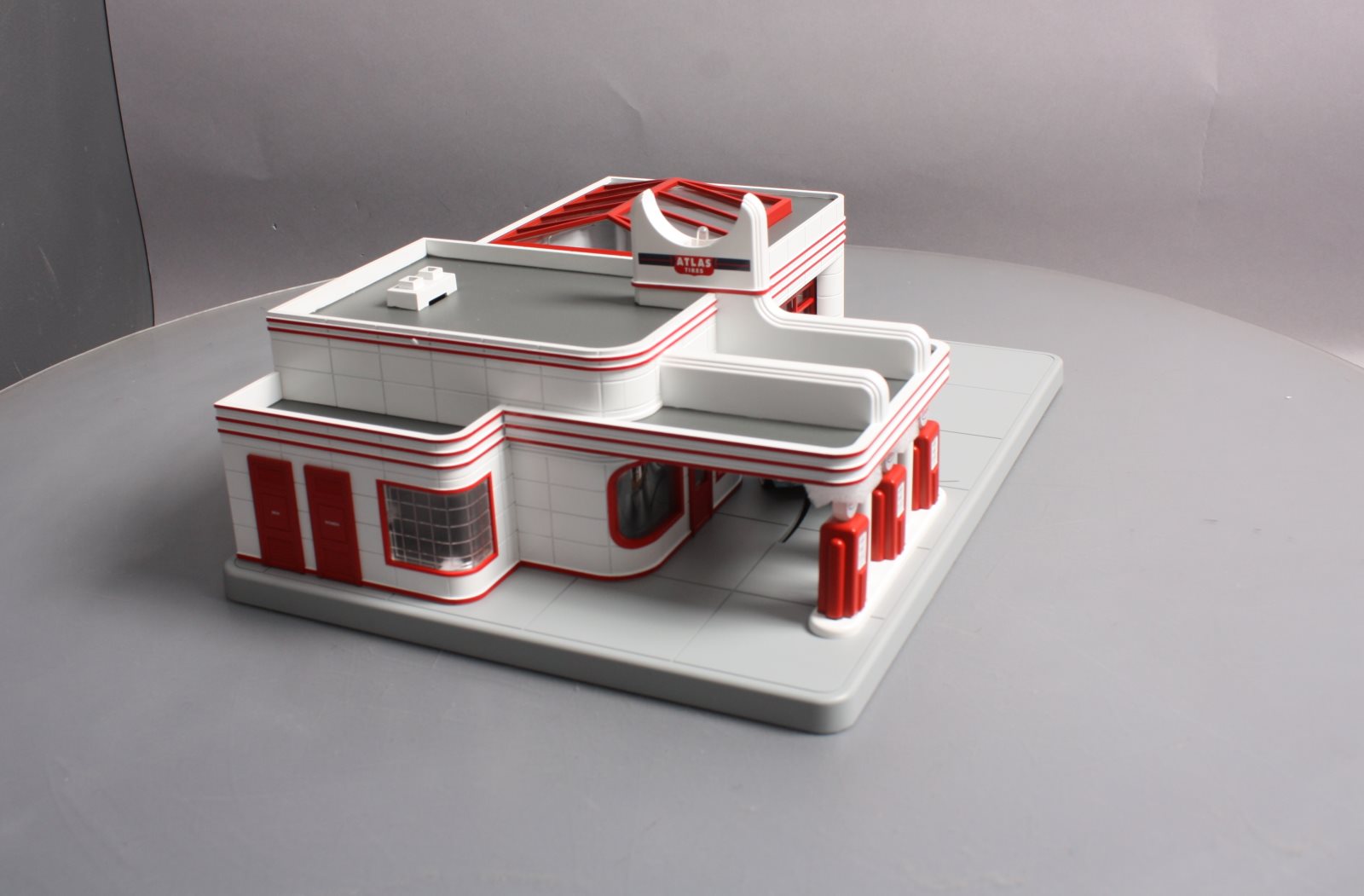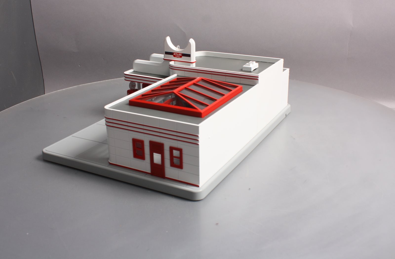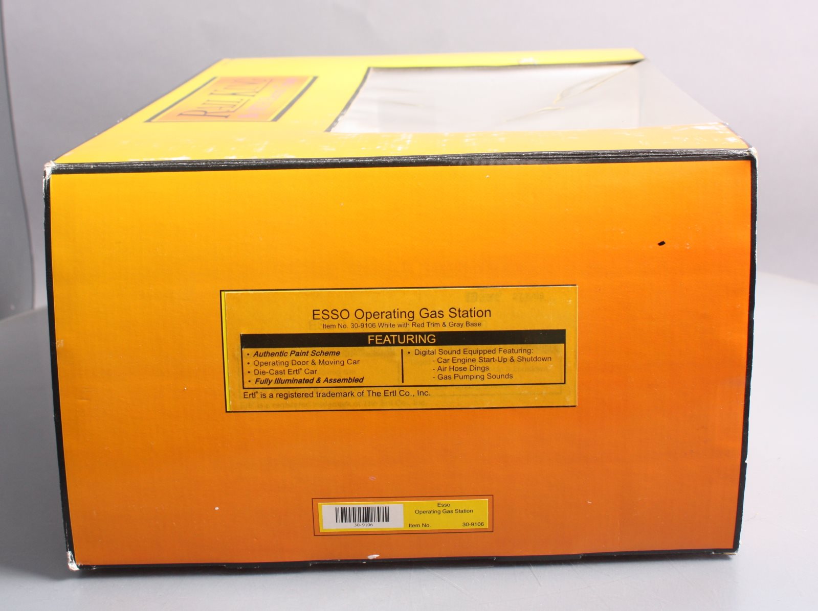 Here is a MTH 30-9106 O Gauge Esso Operating Gas Station. This neat accessory features an operating door & moving car die-cast Ertl car fully illuminated and assembled. In addition this gas station features digital sound including car engine start up & shutdown air hose dings and gas pumping sounds. If you have a lot of automobiles on your layout and no gas station, now is the time to rectify that problem before everyone on your layout gets stranded! Please see my pictures for additional features. Dimensions: 15 x 11 x 6 3/4"