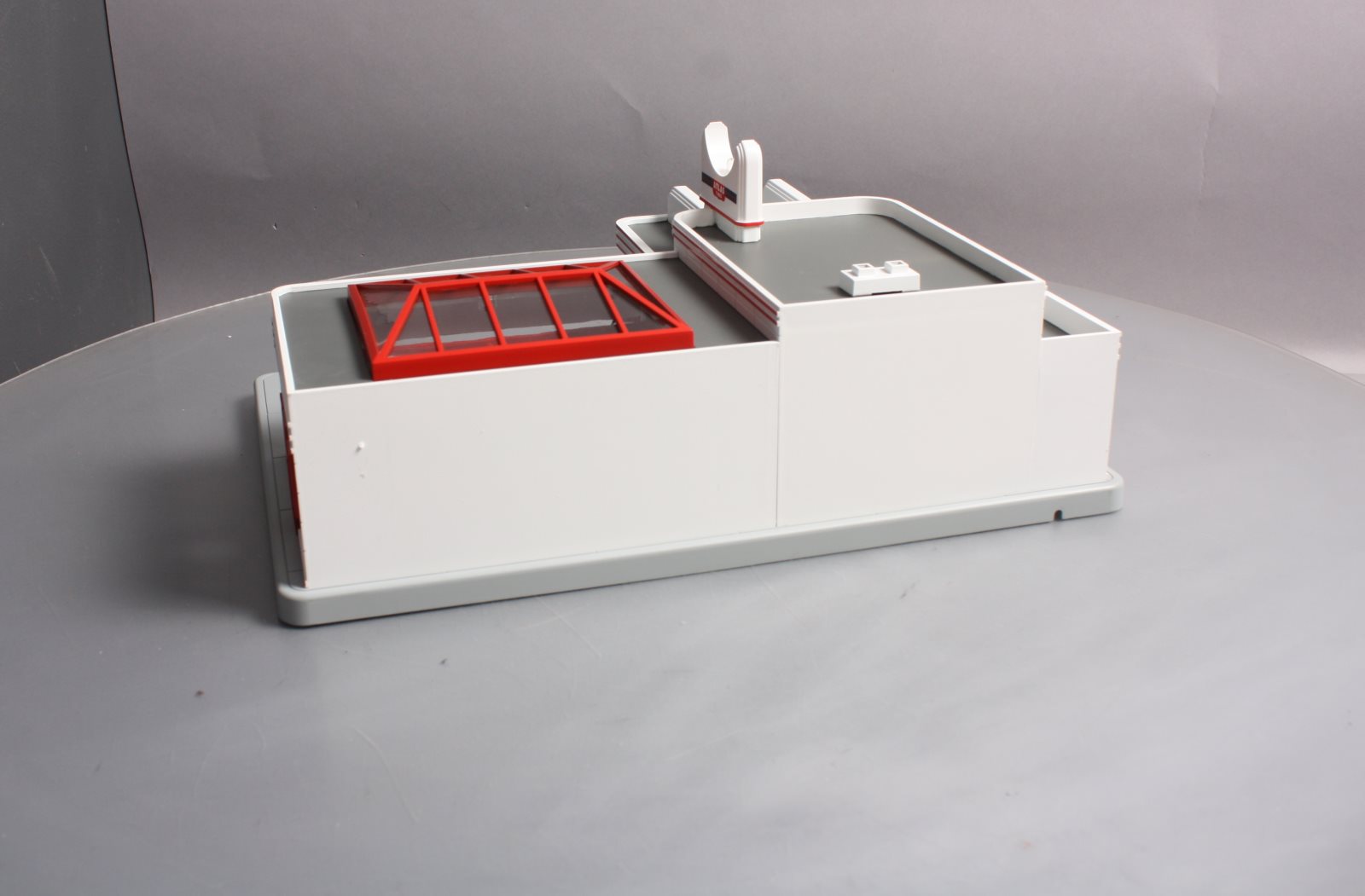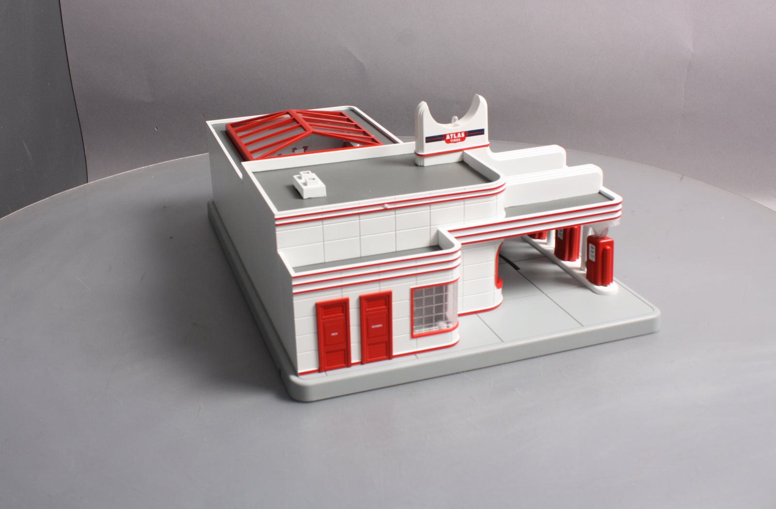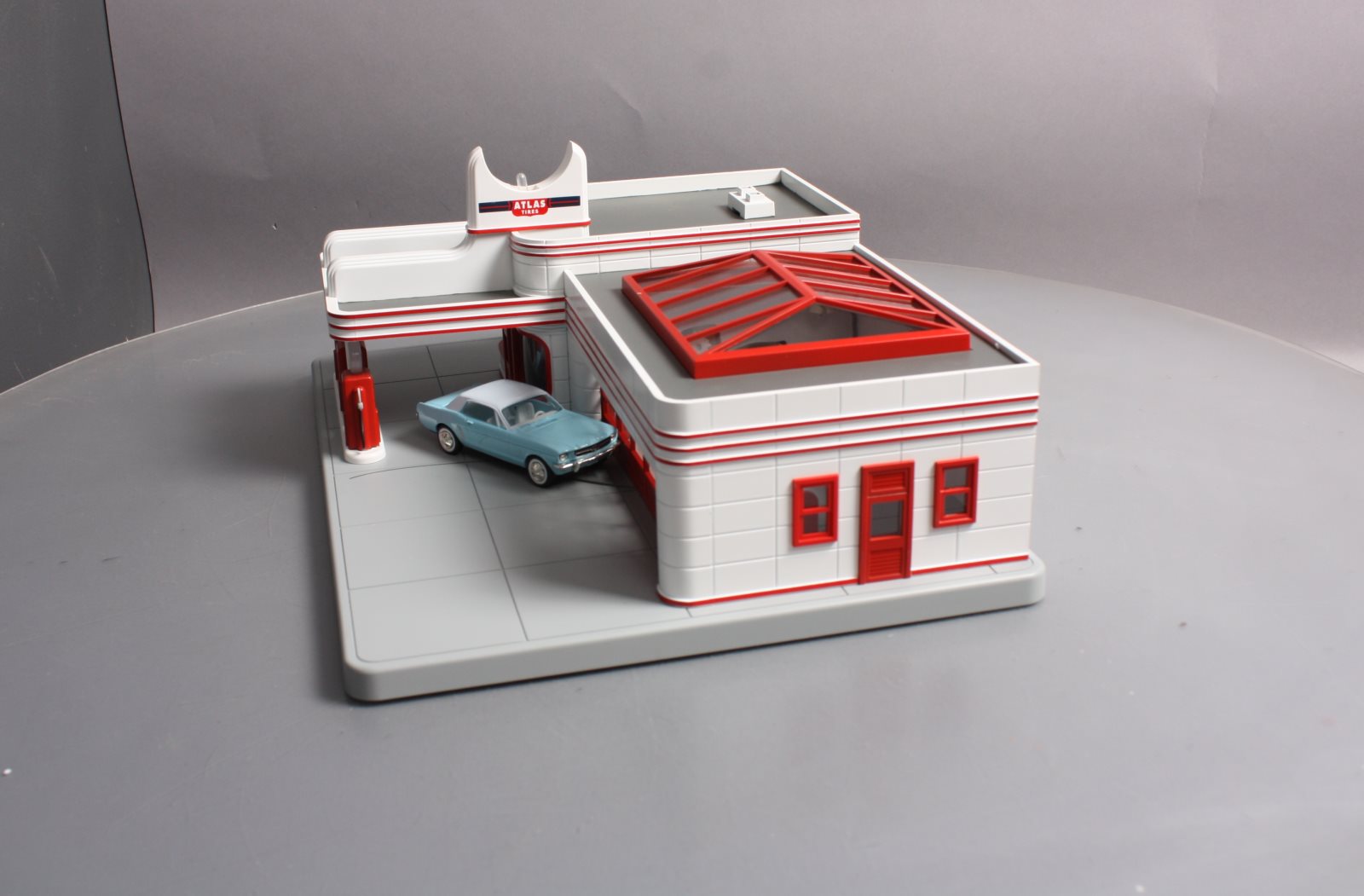 Here is a MTH 30-9106 O Gauge Esso Operating Gas Station. This neat accessory features an operating door & moving car die-cast Ertl car fully illuminated and assembled. In addition this gas station features digital sound including car engine start up & shutdown air hose dings and gas pumping sounds. If you have a lot of automobiles on your layout and no gas station, now is the time to rectify that problem before everyone on your layout gets stranded! Please see my pictures for additional features. Dimensions: 15 x 11 x 6 3/4"