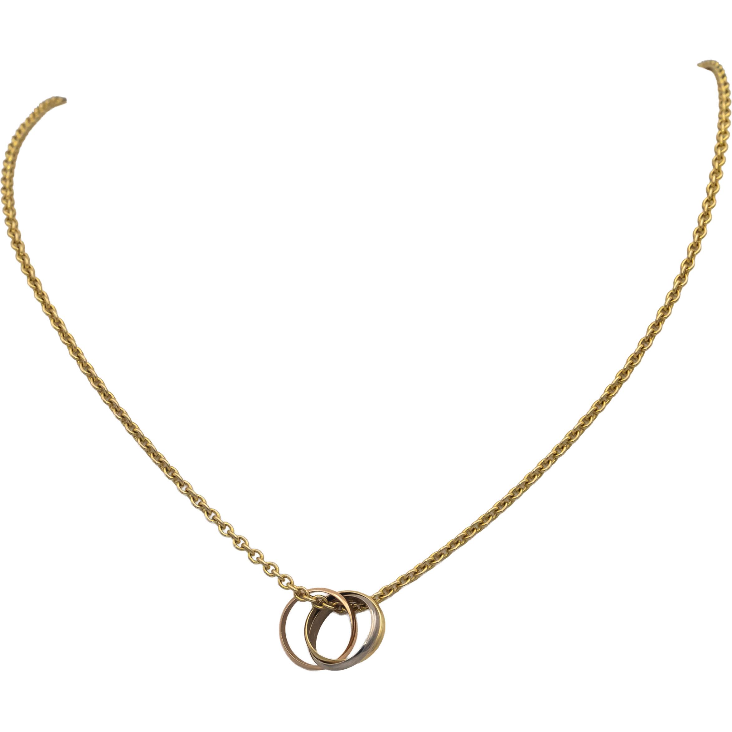 Crafted in 18k gold, the necklace features interlocking rings in rose, white, and yellow gold.