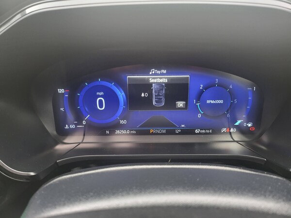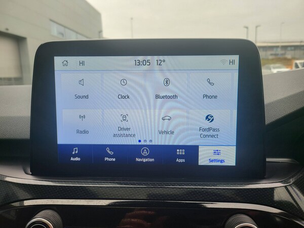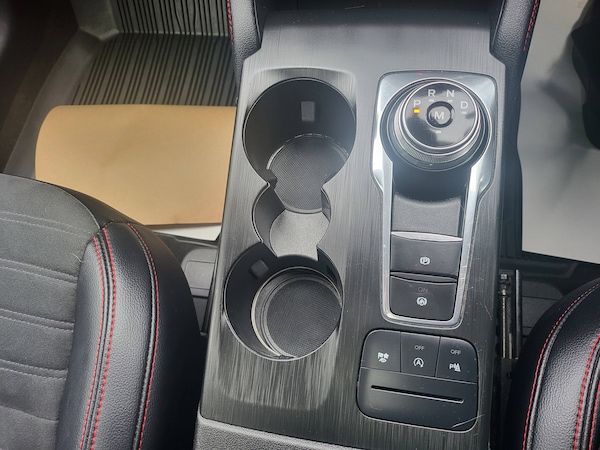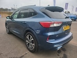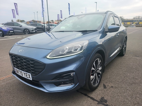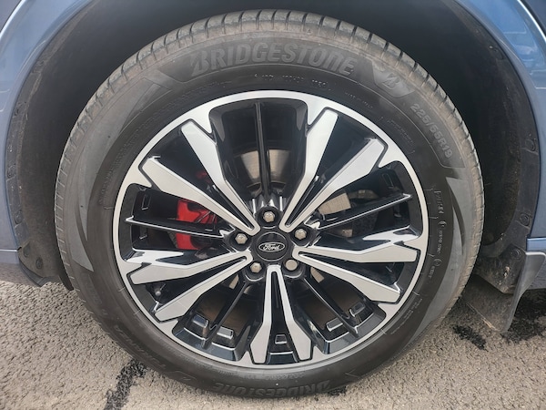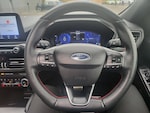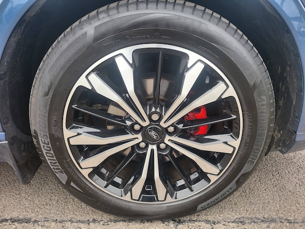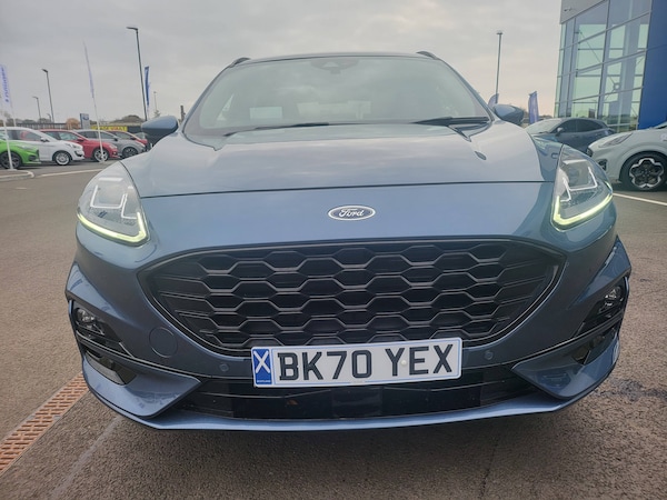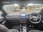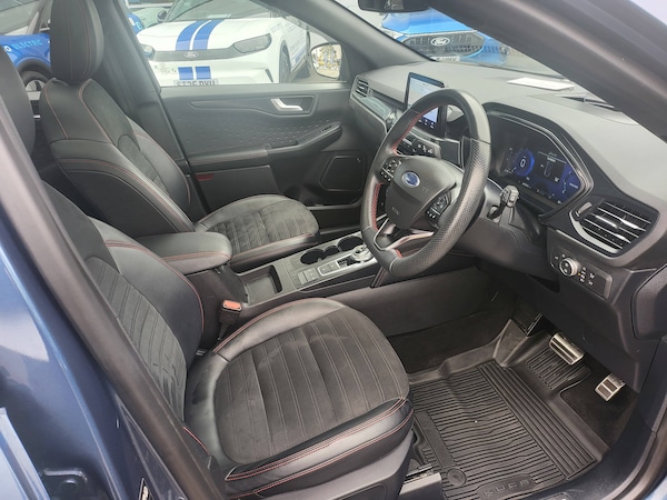 3x3 point rear seatbelts, Airbags - front driver/passenger, front and rear curtain, Drivers knee airbag, Electronic stability control (ESC) and ABS, Ford MyKey Gen 2 safety system, Post collision braking, Powered child proof rear door locks, Pre collision assist with autonomous emergency braking, Red brake calipers, Tyre pressure monitoring system, Cruise control with adjustable speed limiter, Driver impairment monitor, Ford easy fuel, Ford SYNC 3 with 8 inch colour touchscreen, App Link, andriod auto/apple carPlay and navigation with Ford pass connect, Front and rear parking sensors, Hands free power tailgate, Intelligent speed assist, Lane keeping aid with lane departure warning, Mobile phone wireless charging pad, Power assist steering, Selectable drive modes, Auto dimming rear view mirror, Auto headlamps with high and low beam, Auto wipers, Black roof rails, Front LED fog lights with cornering function, Full LED headlamps, Large rear spoiler, LED daytime running lights, LED rear lights, Power folding heated door mirrors with puddle lights, Power front/rear windows with global close, Power opening panoramic roof, Privacy glass, Quickclear heated windscreen, Solid paint, ST Line body styling kit with unique front and rear fascia and bumper, rear painted diffuser, front painted skid plates, dark mesh upper grille, ST Line front scuff plates, Twin exhausts, 10 way power adjustable drivers seat, 2nd row sliding seats, 8 way manual passenger seat including lumbar support and height adjust, Alloy pedals, Ambient lighting, Centre console with electronic parking brake, Dark headlining and pillars, Dual electronic automatic temperature control, Flat bottomed leather steering wheel in sensico with red stitching, Front and rear head restraints, Heated passenger and driver seats, Rear charging point, Sensico partial premium leather upholstery, Sports seats, ST Line front and rear floor mats, Steering wheel mounted paddle shift, BandO with large instrument cluster pack - Kuga, Engine immobiliser, Keyless entry, Keyless start with 'Ford Power' starter button, Locking wheel nuts, Remote powered central double locking doors, Thatcham category 1 alarm, 19 inch 5x2 spoke high gloss machined alloy wheels, Tyre inflation kit
