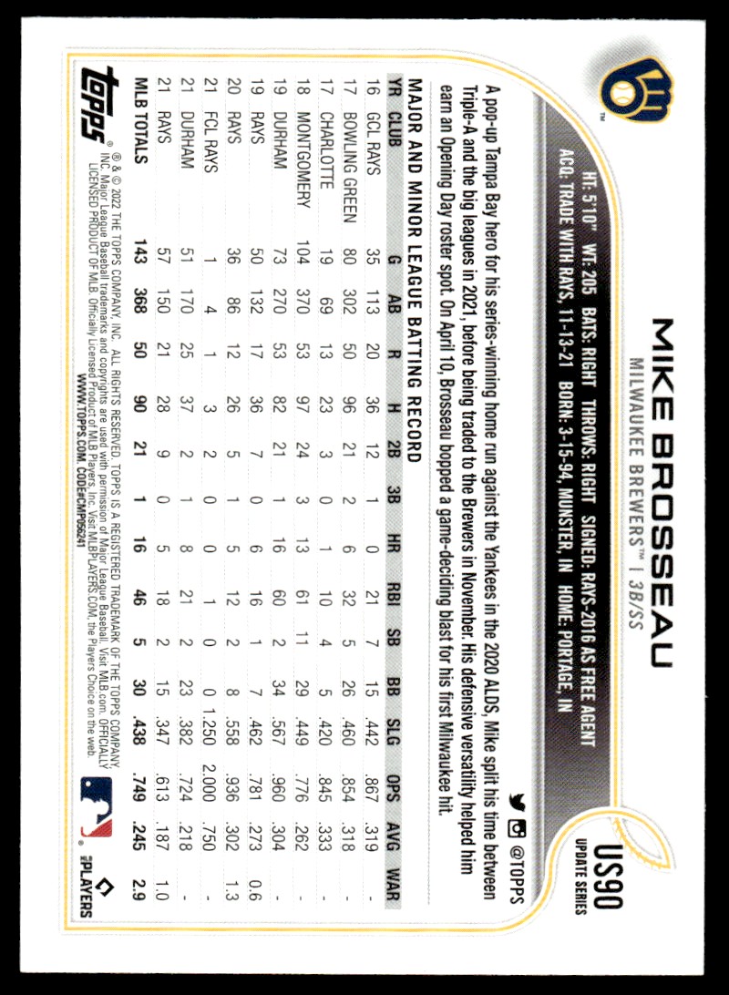 | Description: | Mike Brosseau | | Category: | Baseball | | Year: | 2022 | | Product: | Topps Baseball Card | | Team: | Milwaukee Brewers | | Card Number: | US90 | | Dimensions: | 3½" x 2½" |