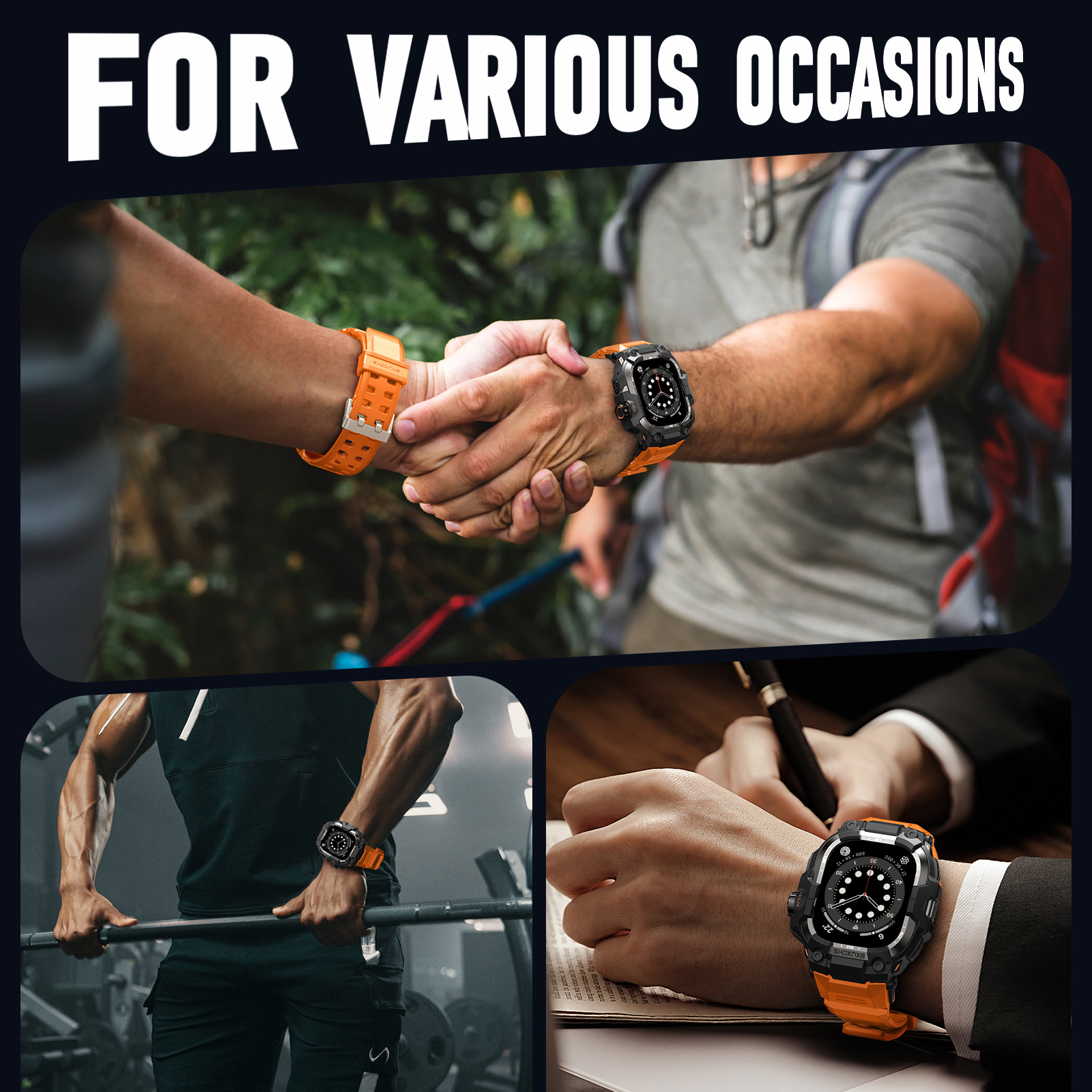Rugged and Durability: 360° full protective rugged watch band is constructed from reinforced TPU and metal, the Rugged Case with military grade toughness to protect the watch from drop, 3D raised bezel to avoid scratch and shock from accident. The iwatch band men is all round protected