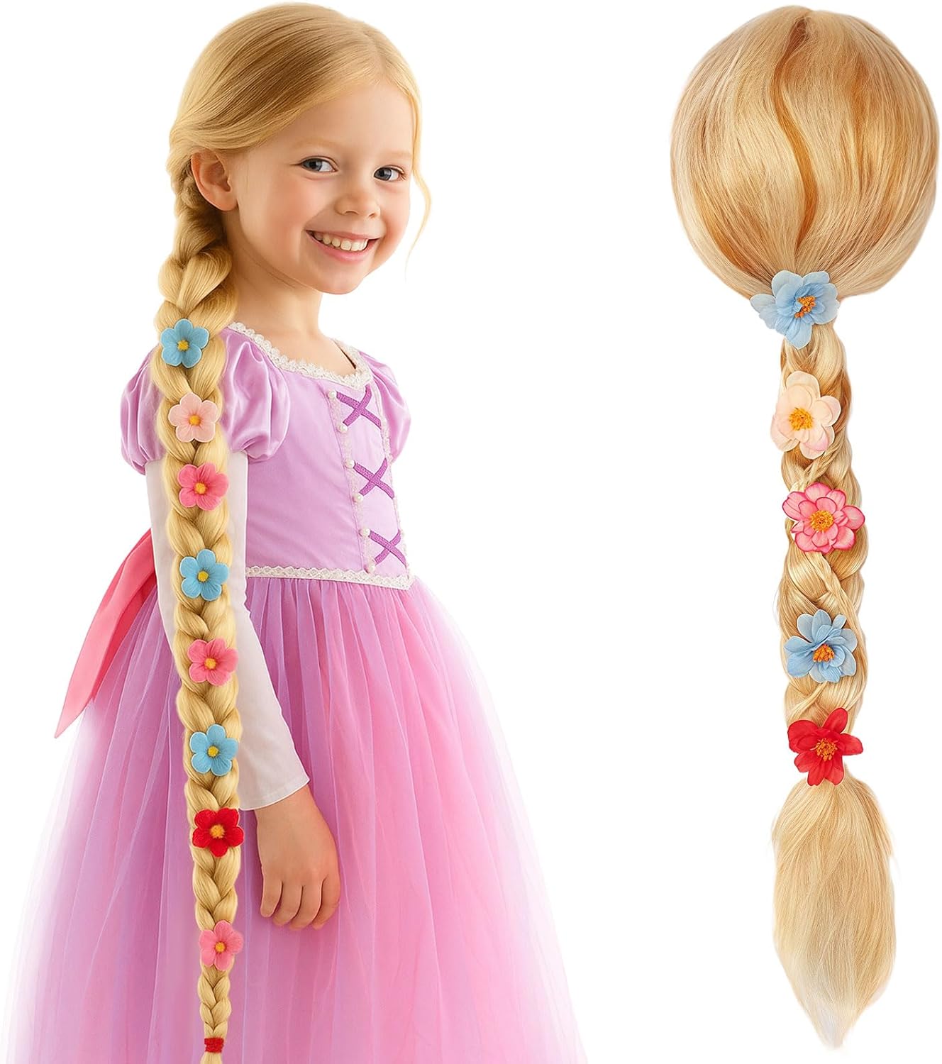 Girls Princess Wig,Rapunzel Plaits Blonde blonde rapunzel wig,tie dye flowers decorations,Halloween costume wig for Girls Halloween Party