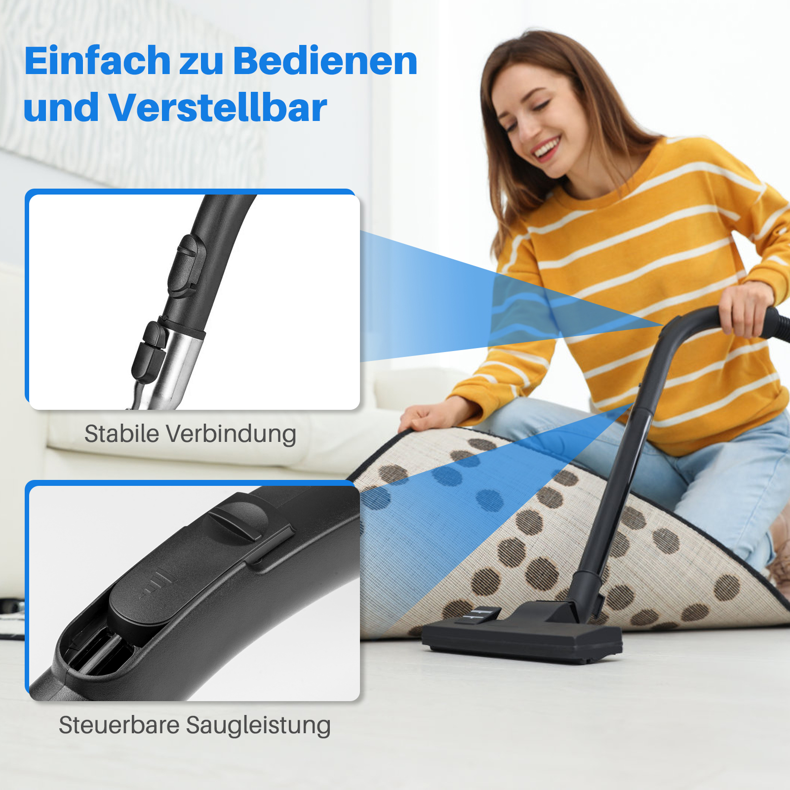 Die Saugleistung lässt sich einfach über eine Saugkraftregulierung am Griff und an jede Oberfläche, z.B. Teppiche, Fliesen, Polster, Polster usw