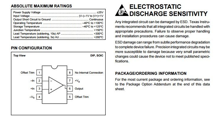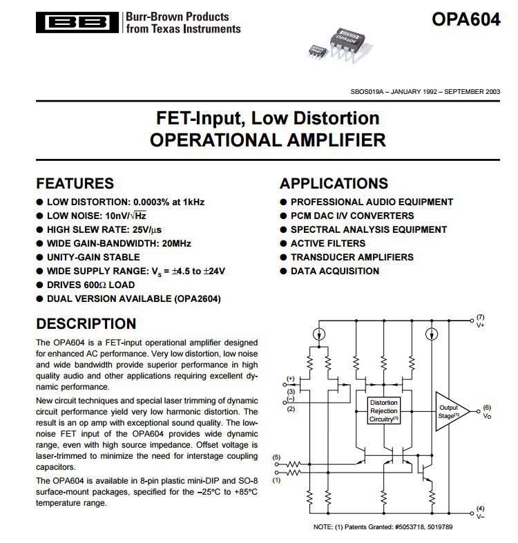The low-noise FET input circuit of OPA604AP provides a large dynamic range and a small offset voltage. The operating voltage range can be from ±4.5V to ±24.0V, the distortion is only 0.0003% at 1KHz, the conversion rate is 25V/μs, and the gain bandwidth It is 20MHz.