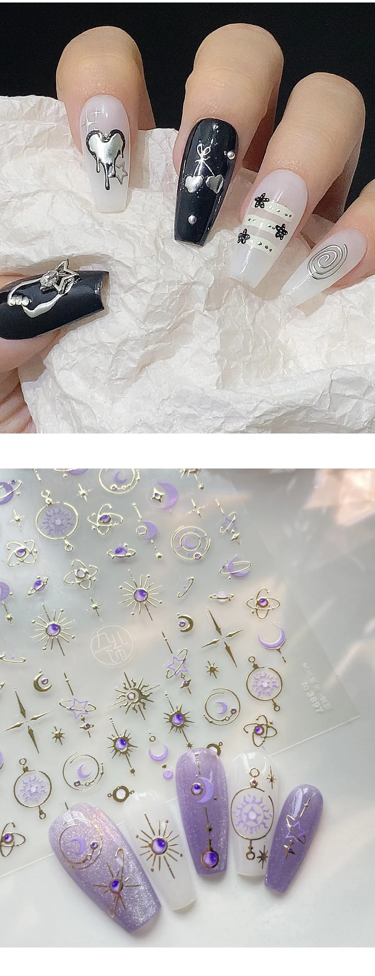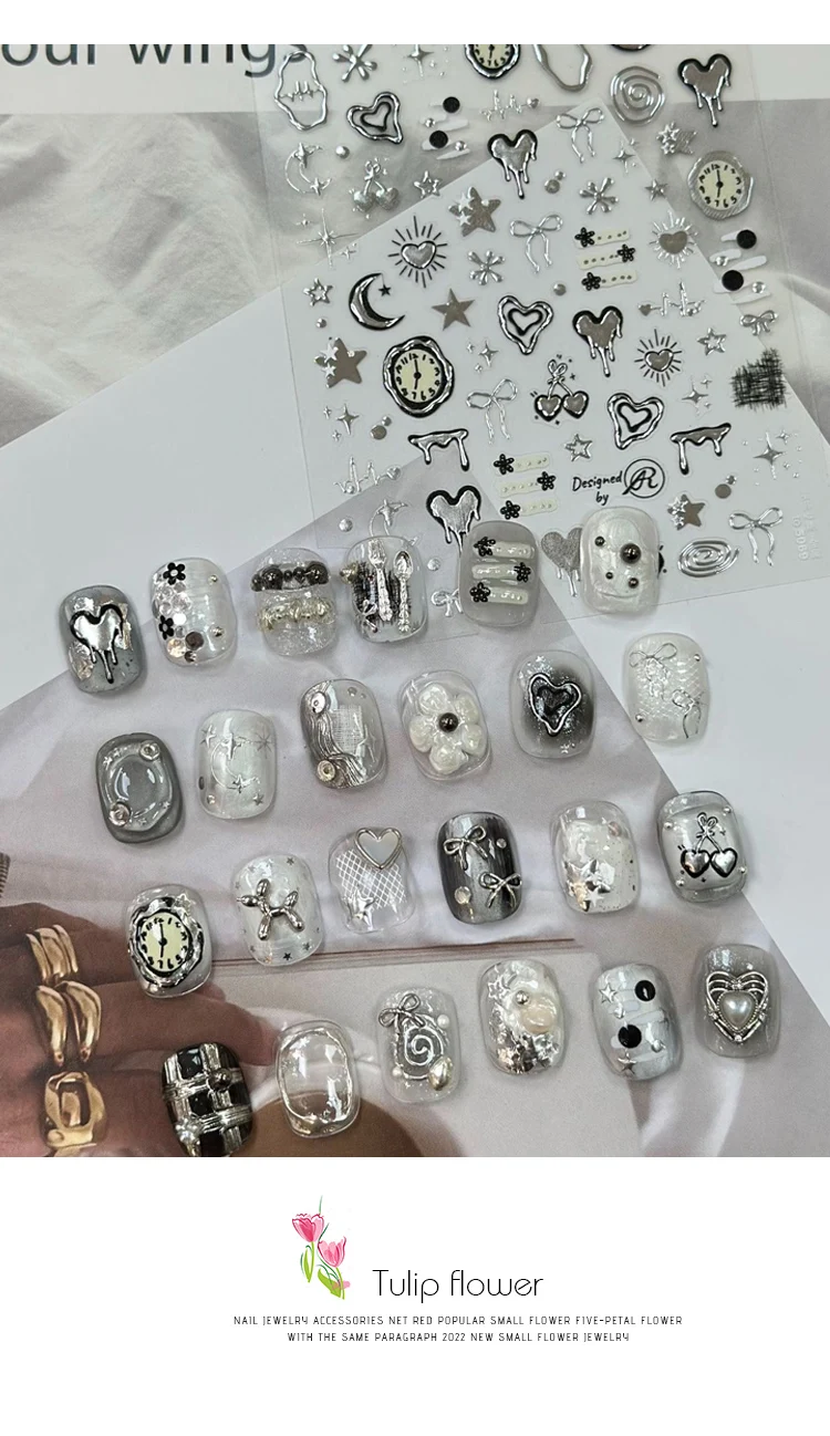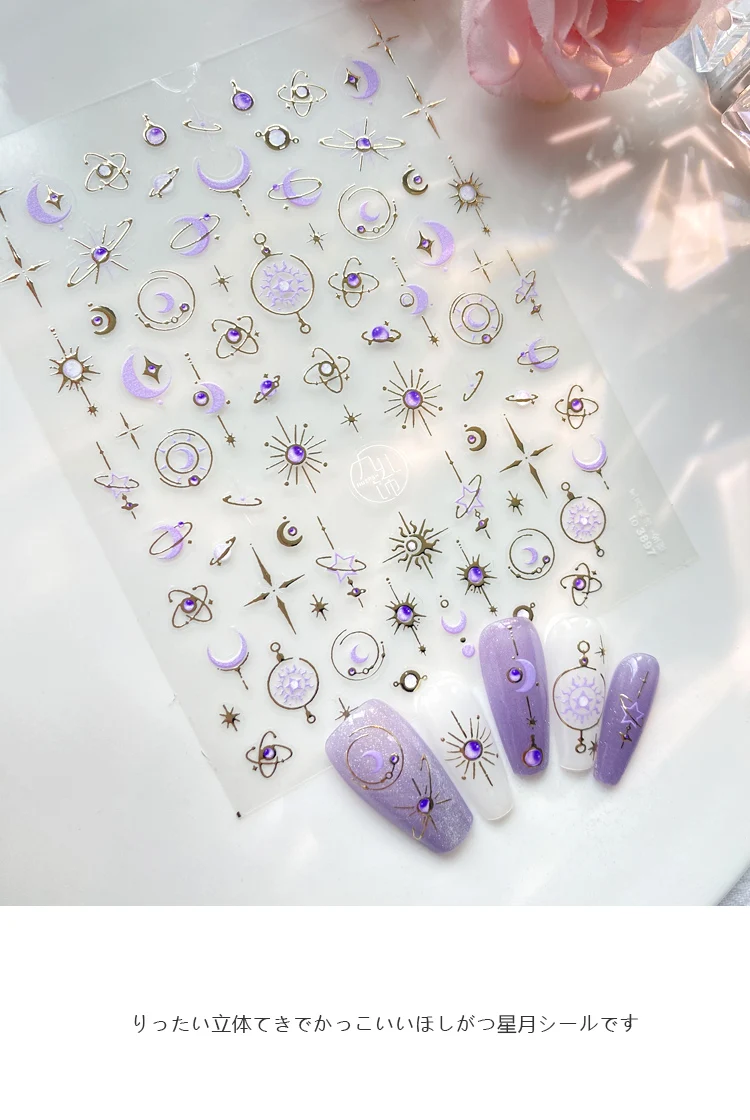 3D Cool Silver Star Heart Nail Art Stickers INS Purple Star Moon Nail Decals Kawaii Nail Sticker