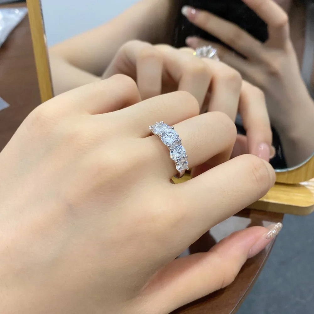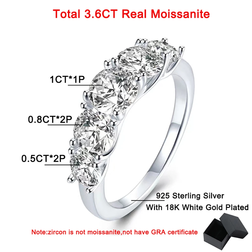 GRA Certified 5 Stone 3.6cttw All Moissanite Engagement Ring for Women Gradient Lab Diamond S925 Silver Wedding Band Jewelry Material:925 sterling silver+18k white gold plated Total Moissanite Carat:6.5mm(1ct)*2pcs+6mm(0.8ct)*2pcs+5mm(0.5ct)*2pcs Total 3.6ct/piece Moissanite Ring