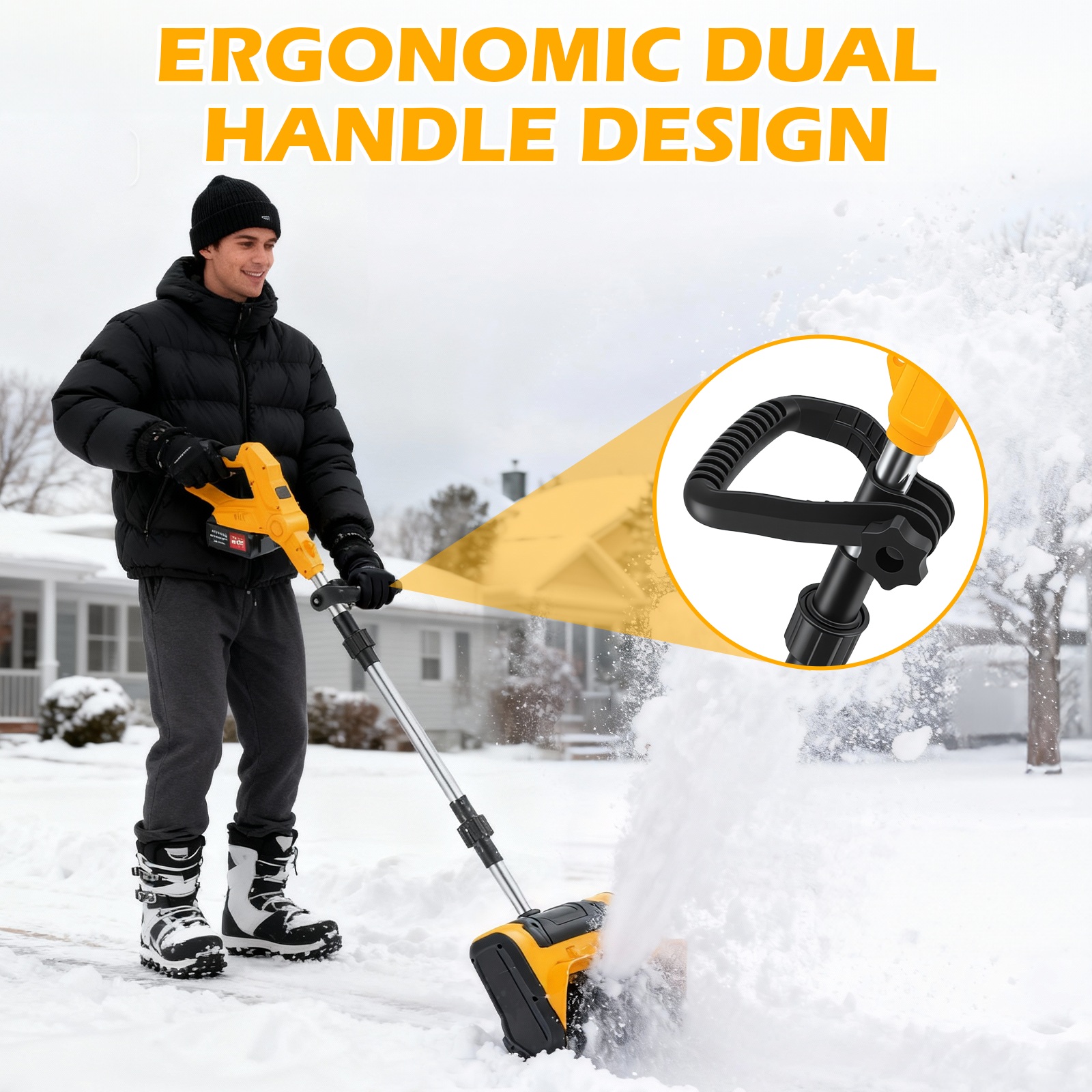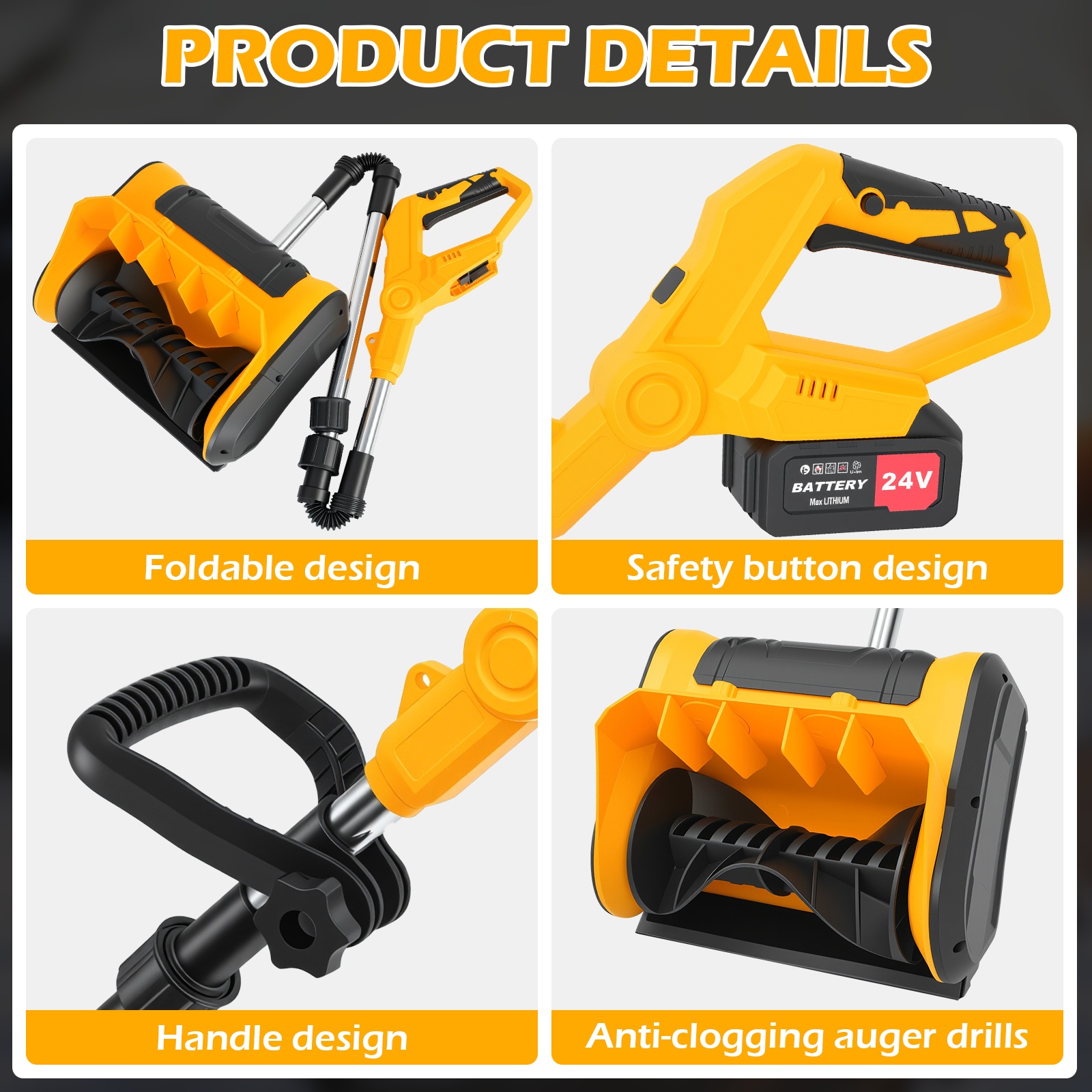 With this machine in hand, clearing snow in winter becomes easy and efficient! Equipped with an 11-inch snow-clearing roller, it offers a cutting depth of up to 6 inches and a maximum snow-throwing distance of 8 meters, allowing for quick snow removal on driveways, steps, patios, and other areas. Powered by a 24V 4Ah removable lithium battery, it provides up to 25 minutes of runtime and recharges fully in just 90 minutes, enabling truly cordless and free operation. Weighing only 6.61 pounds, the machine features an aluminum main shaft and impact-resistant polymer housing for lightweight durability, along with dual adjustable handles for comfortable control. Its innovative anti-clogging spiral technology ensures smooth operation on various surfaces, including concrete, asphalt, and gravel. Multiple safety switches and a waterproof battery compartment design provide comprehensive protection for safe use.