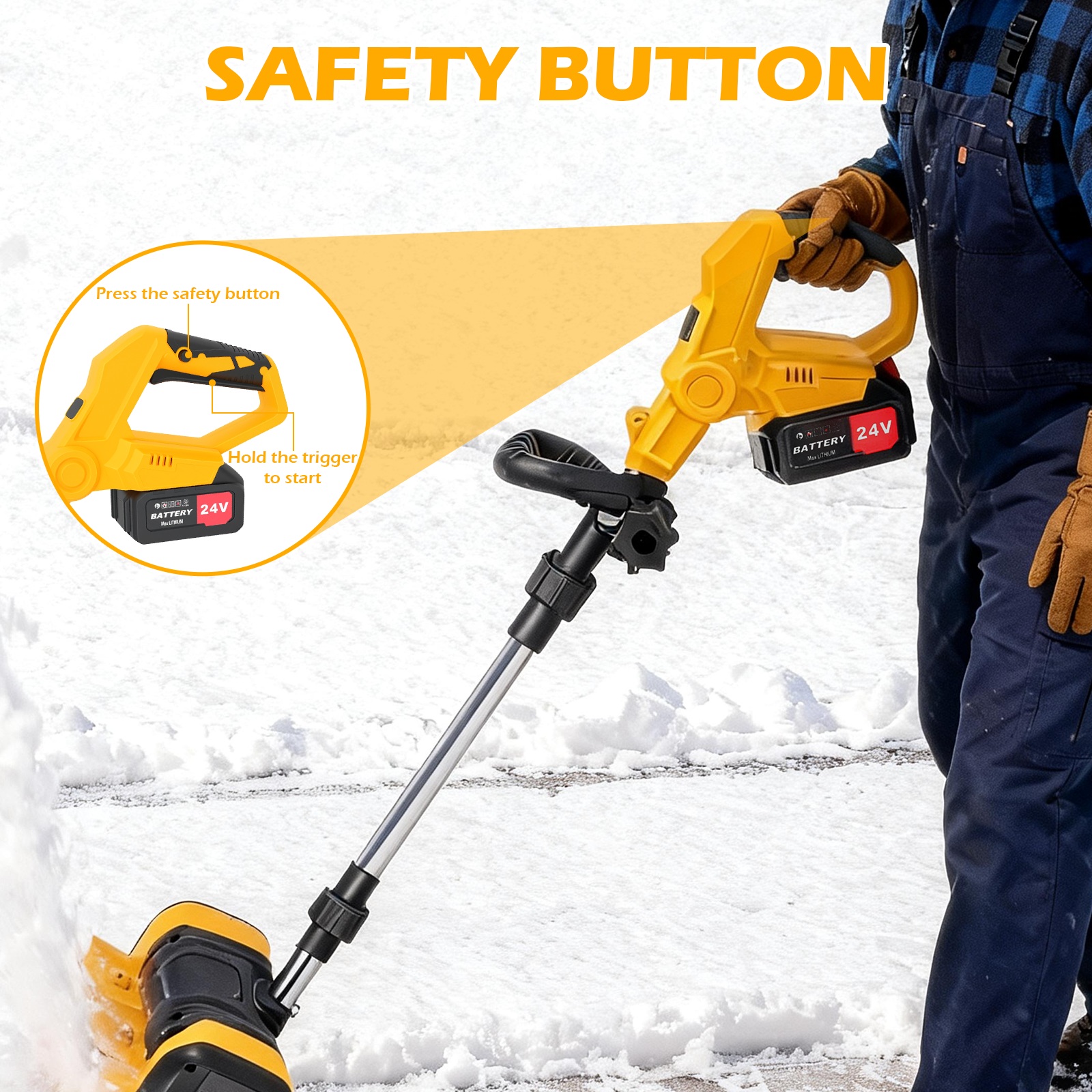 Dual safety switches, a one-touch safety lock, and a waterproof battery compartment prevent accidental starts and protect against moisture. Stay safe while working in snowy conditions.