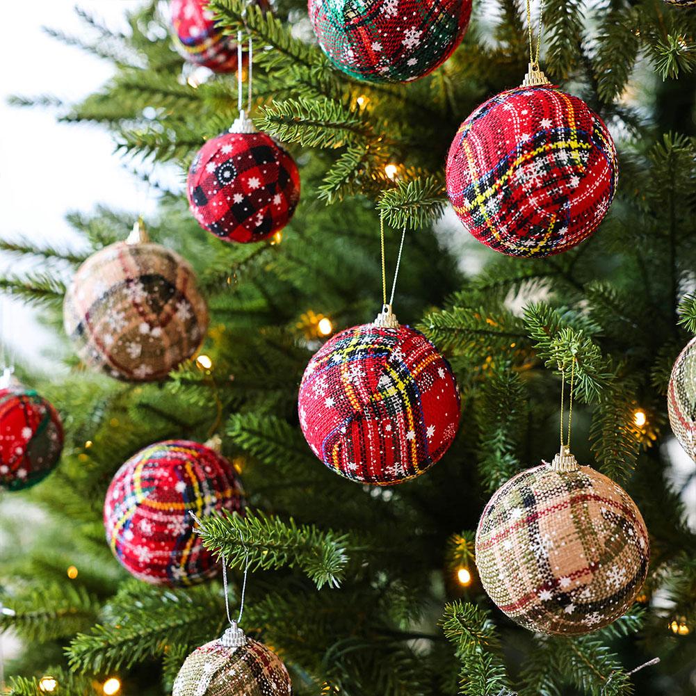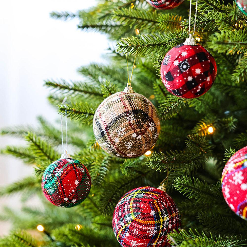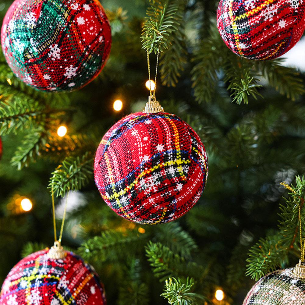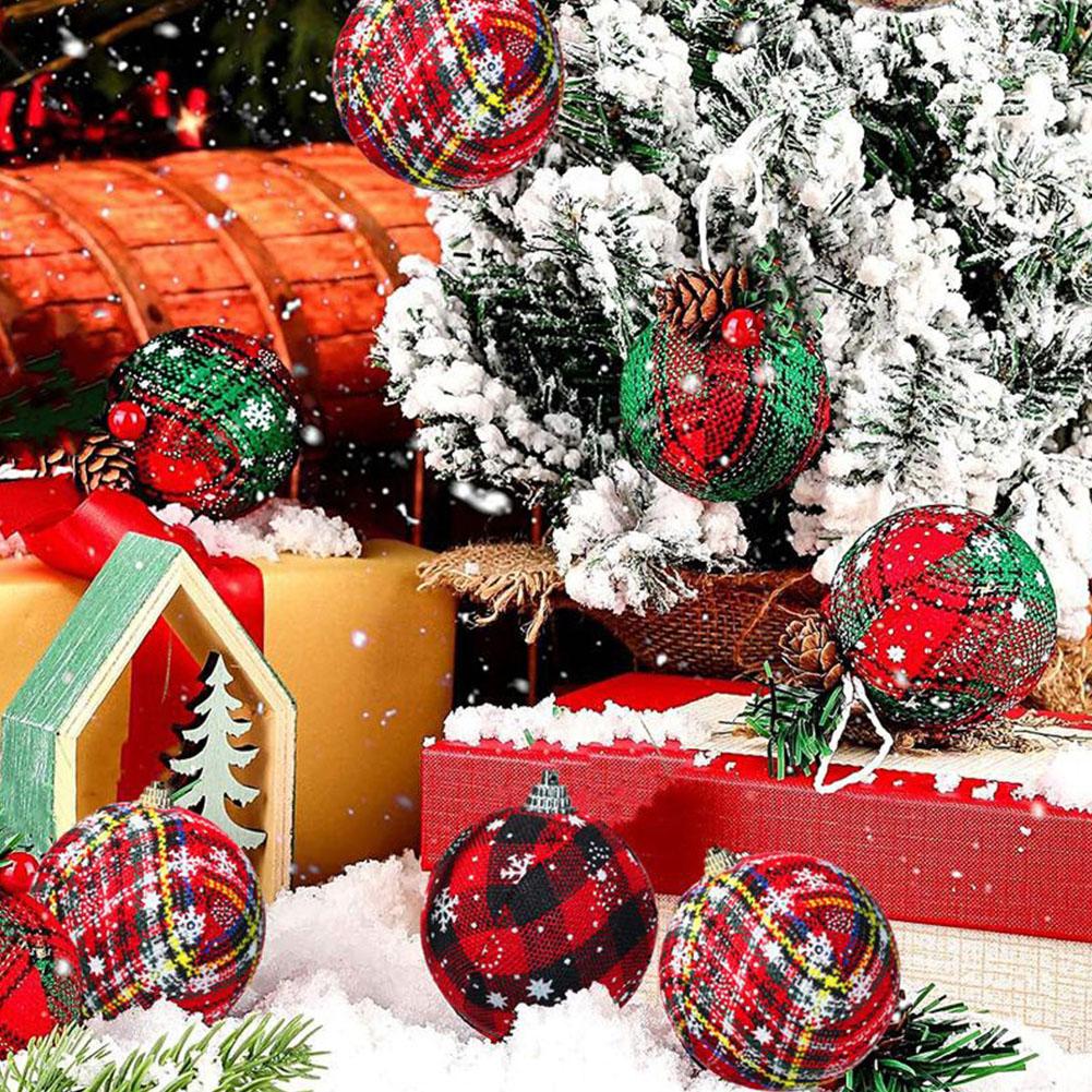 2. Crafted with high-quality fabric wrapped around sturdy spherical bases, these 2.36-inch ornaments showcase classic red, green, and black tartan patterns that evoke timeless holiday charm.