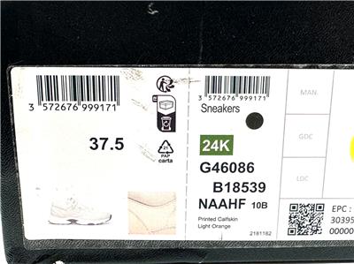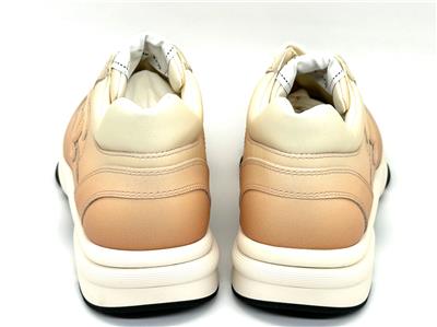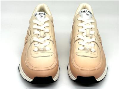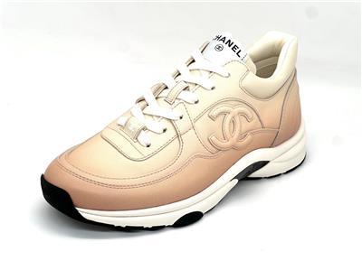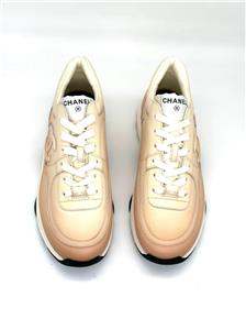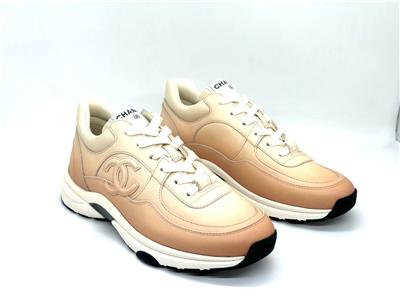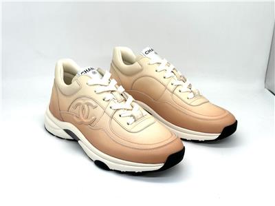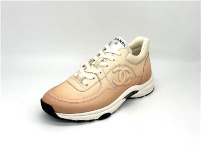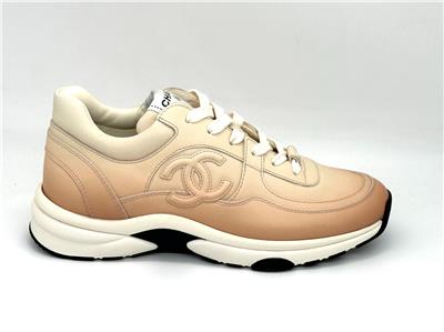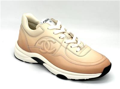 Calfskin leather lace up sneakers with CC logo on the sides. Removable padded insole. Rubber sole. Made in Italy. Designer color: Light Orange.