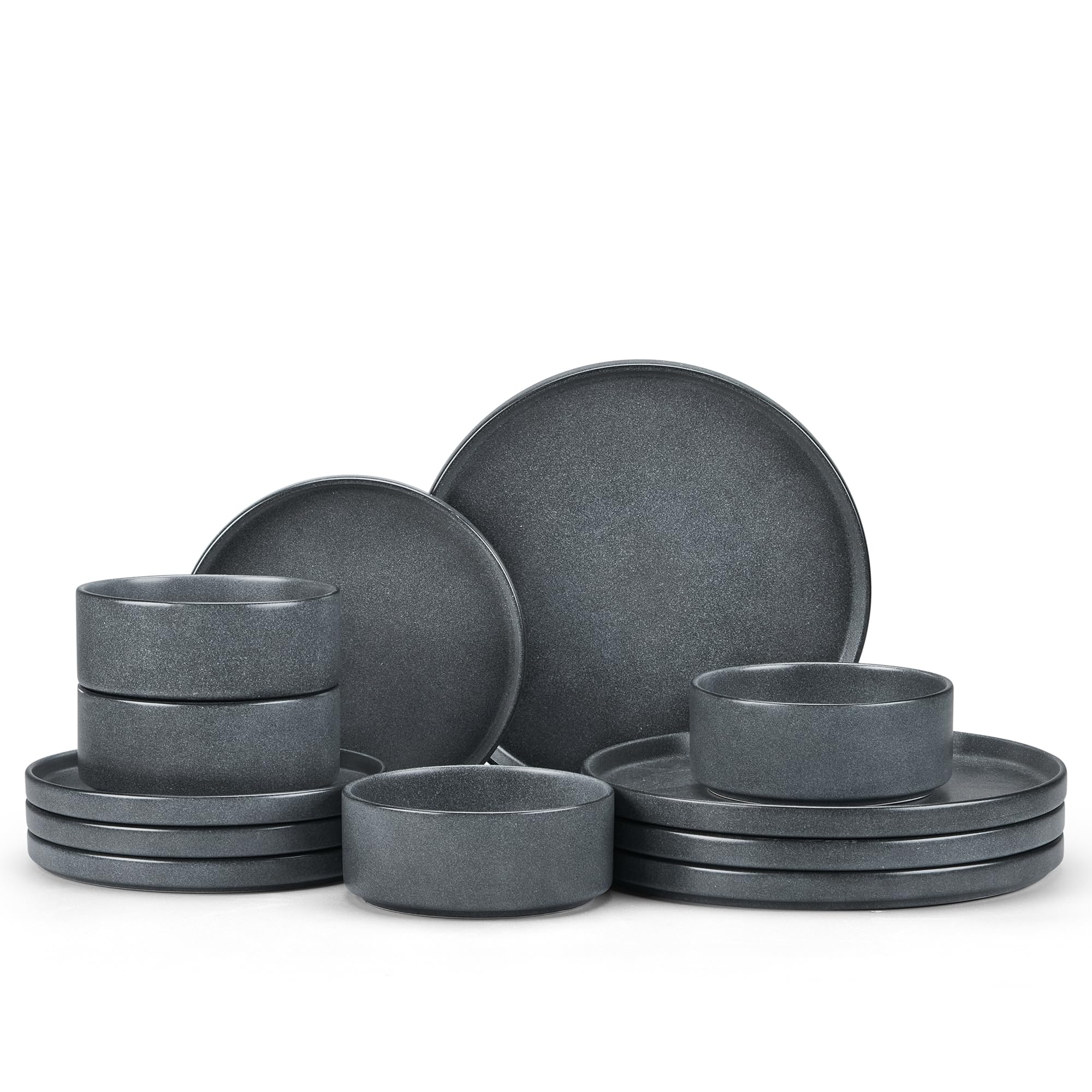 E-far Stoneware Dinnerware Sets for 4, 12-Piece Reactive Glaze Plates and Bowls Sets, Kitchen Ceramic Dishes Dinning Ware, Microwave & Dishwasher Safe, Deep Gray