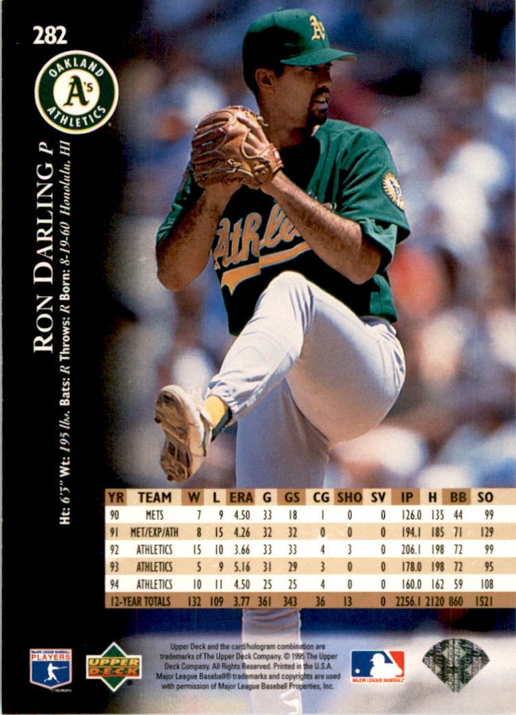| Description: | Ron Darling | | Category: | Baseball | | Year: | 1995 | | Product: | Upper Deck | | Team: | Baseballl Cards | | Card Number: | 282 | | Dimensions: | 3½" x 2½" |
