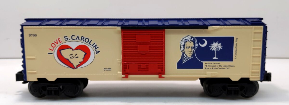 Here is a Lionel 6-19987 O I Love South Carolina Boxcar from 2000. It has two opening doors, die-cast trucks and two operating couplers. Please see my pictures for additional features.