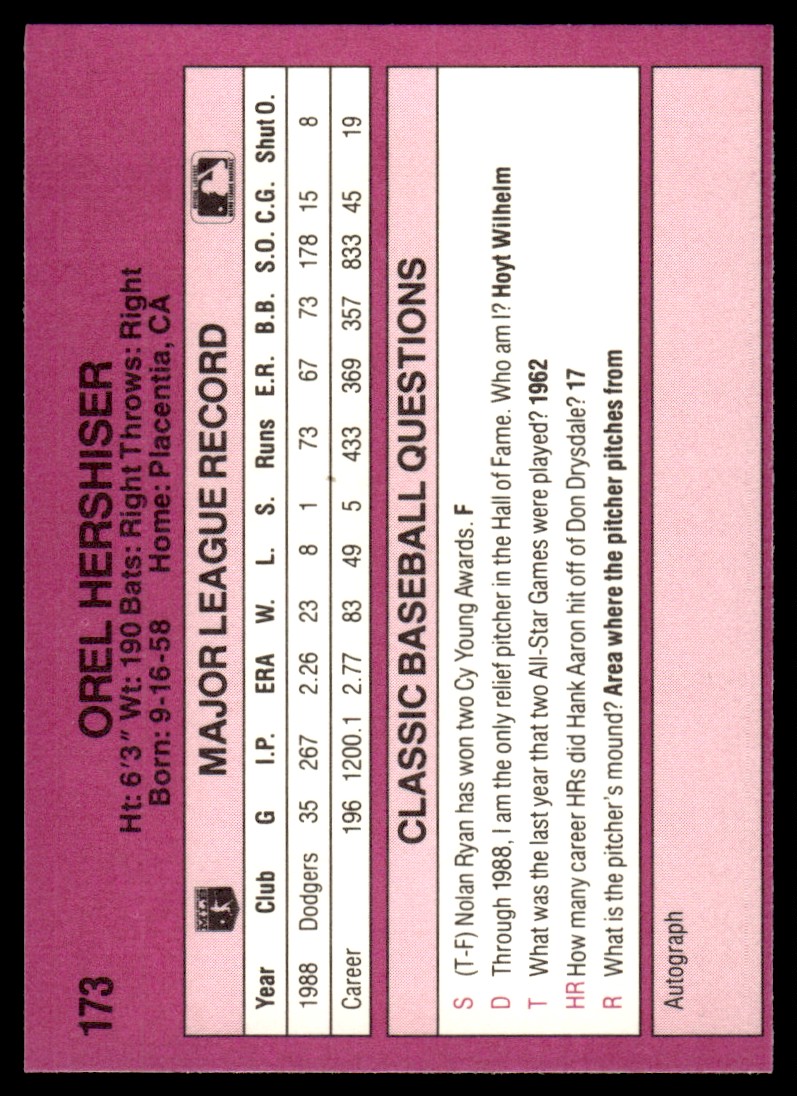 | 1989 Classic Travel Orel Hershiser Los Angeles Dodgers #173 |