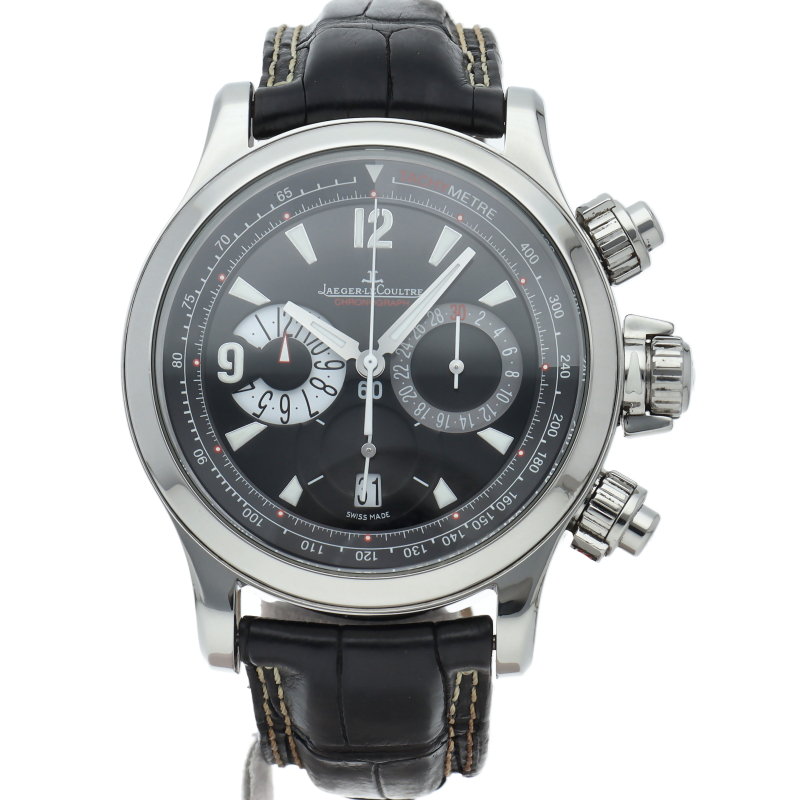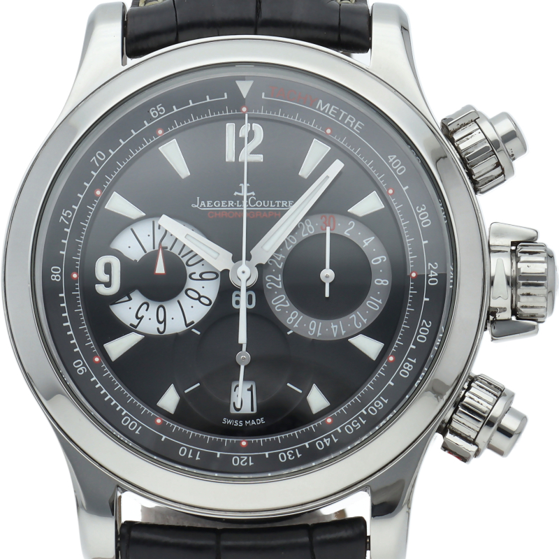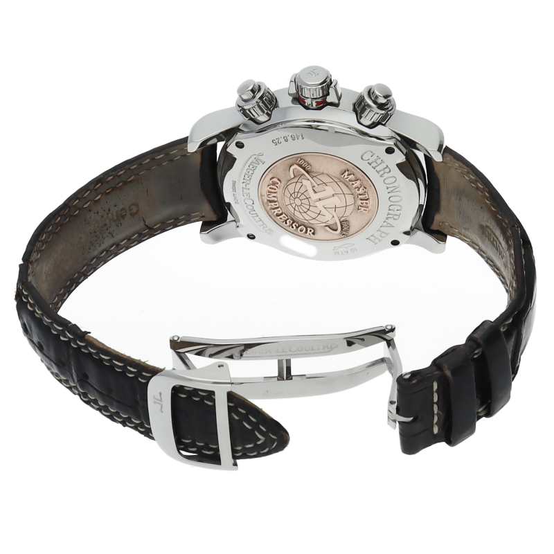 | This is a chronograph model from the popular "Master Compressor" sports series, representing LeCoultre. The crown and two chronograph pushers are equipped with a special compression key structure patented by LeCoultre. Q1758470/146.8.25 |