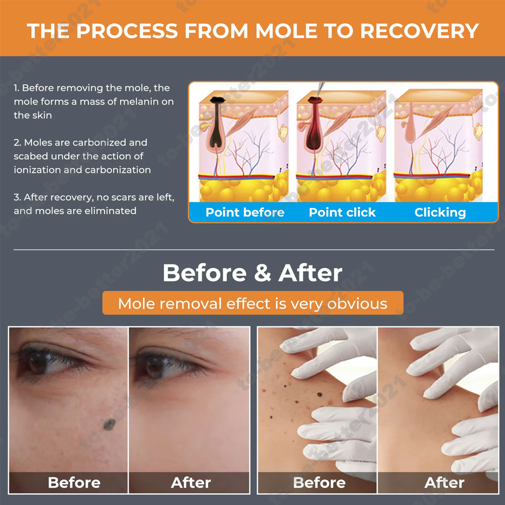 Using ionized carbonization technology, it physically removes moles and spots, safely and painlessly, with no side effects and no rebound, leaving your skin smooth and clean.
