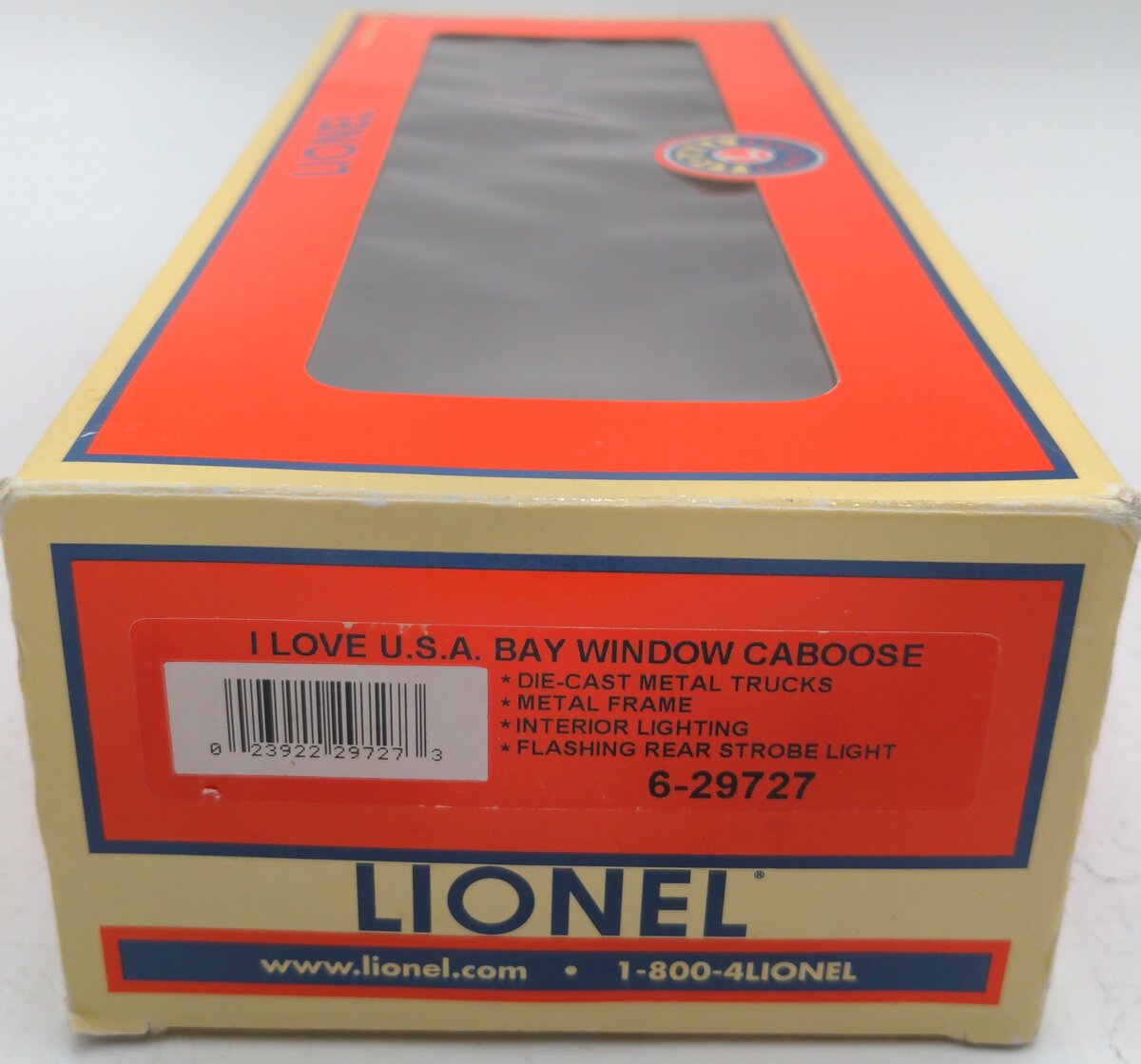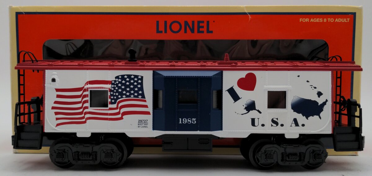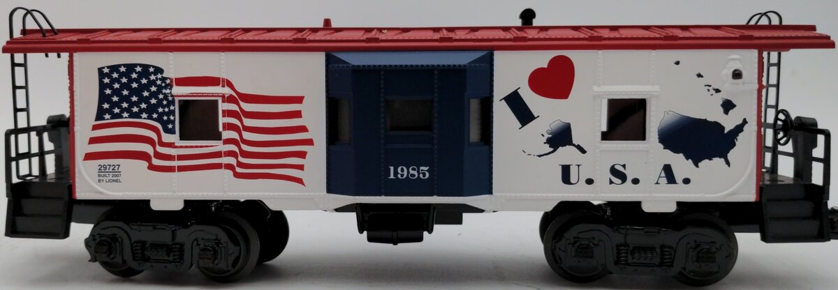 Here we have a Lionel 6-29727 O Gauge I Love USA Bay Window Lighted Caboose #1985. This caboose features interior illumination, a flashing rear strobe light, a metal frame, die-cast metal trucks, die-cast metal operating knuckle couplers, metal wheels and axles.