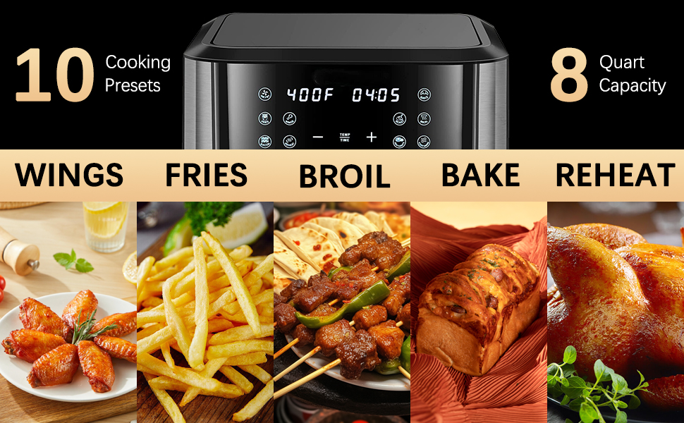 🥞【Mini Size, but Large Capacity】This air fryer is compact in size, practical, and space-saving. The upgraded 8L large capacity rack allows you to prepare 4 to 7 portions of food at a time. It’s the perfect cooking helper for your family, ideal for every occasion. The compact air fryer size saves you space, perfect for a small kitchen, dorm room, RV trips, and more!