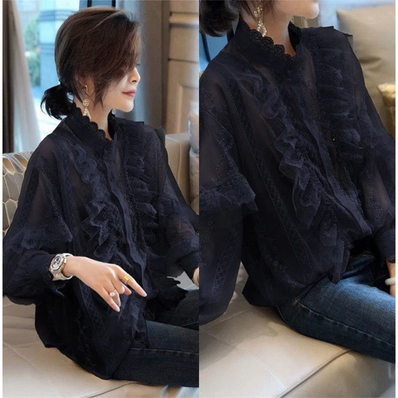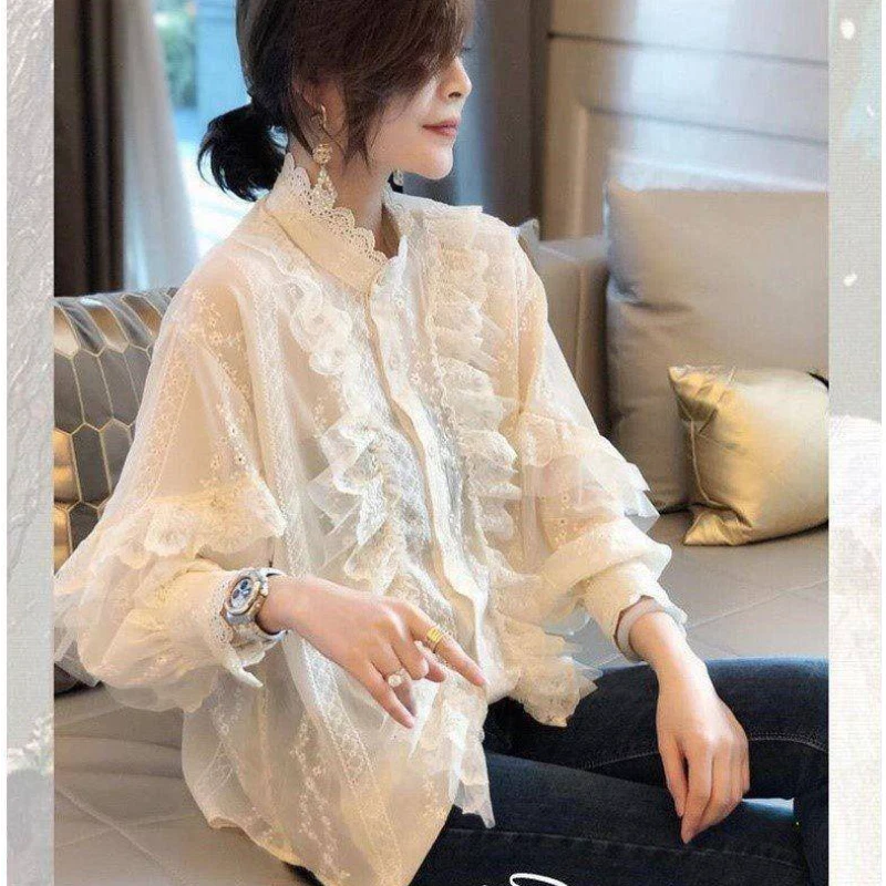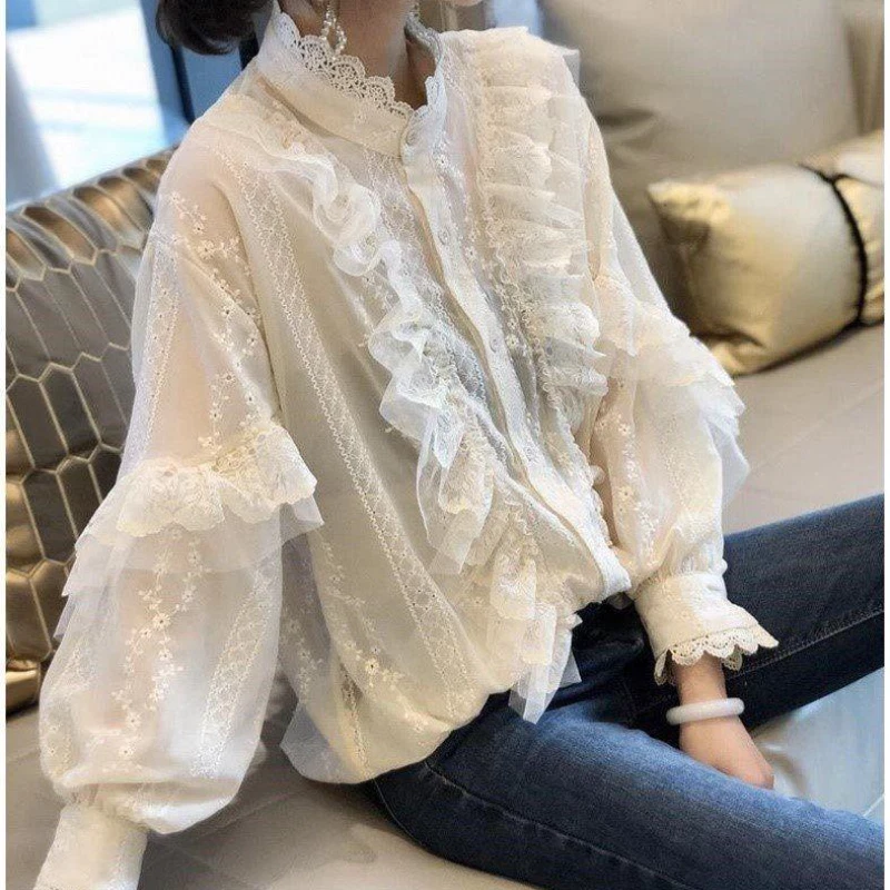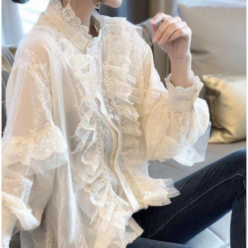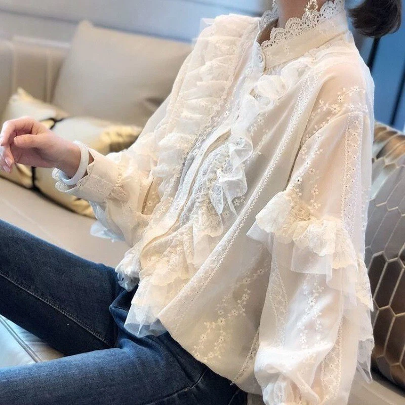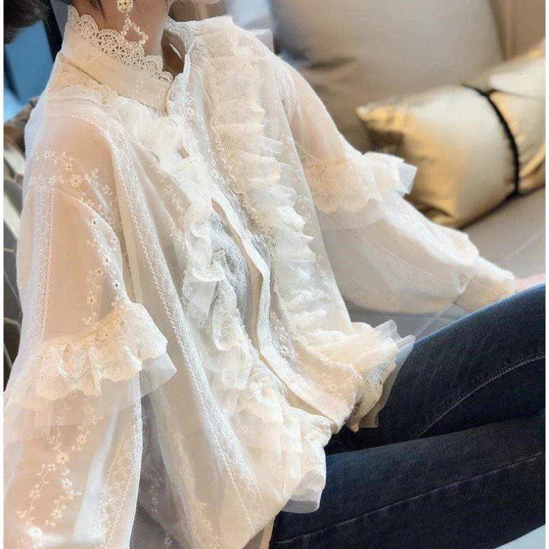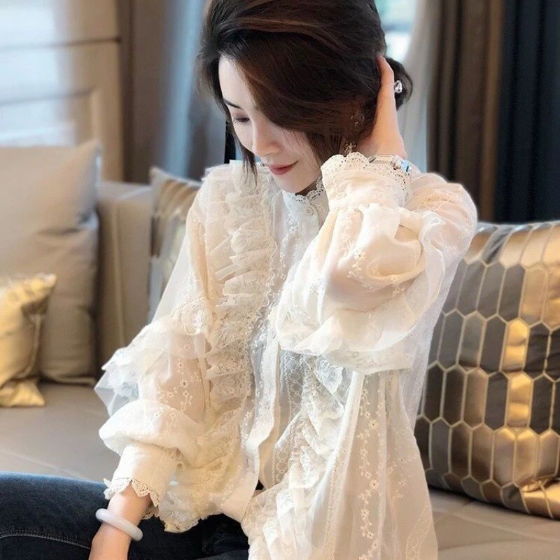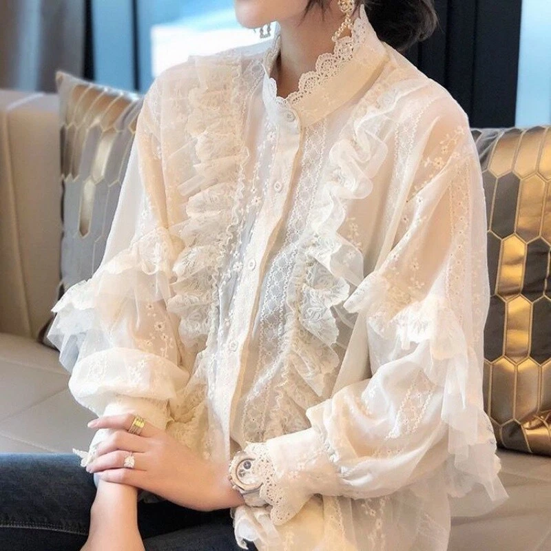 Lady Floral Lace Ruffle Shirt Blouse Baggy Stand Collar Long Puff Sleeve Top New