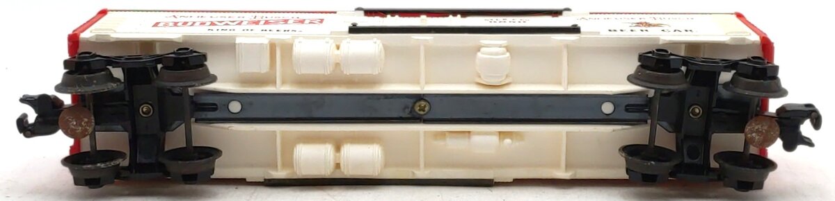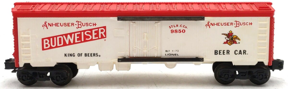 This is a Lionel 6-9850 O Gauge Budweiser Beer Billboard Reefer from 1973-75. This reefer car features sliding doors, plastic trucks, operating knuckle couplers, metal wheels and axles.