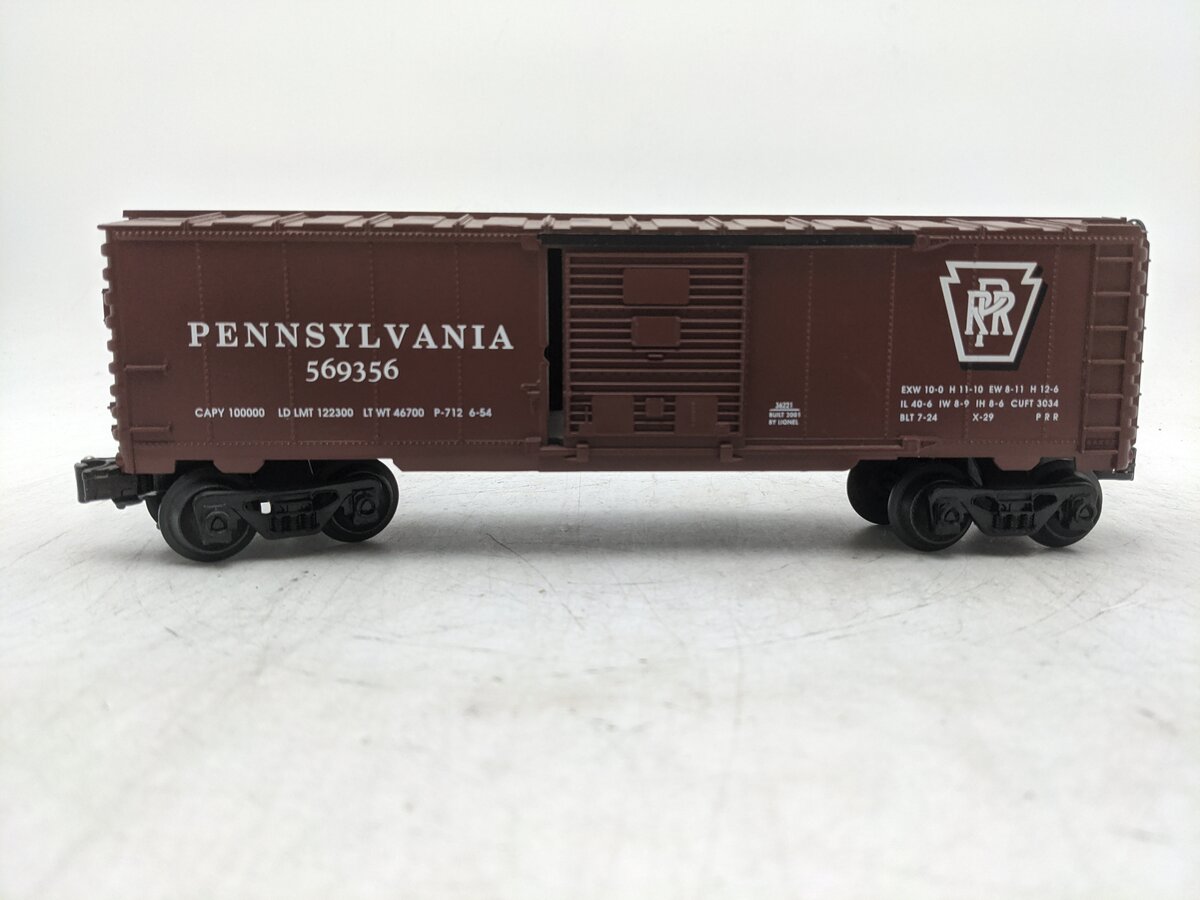 Here is a Lionel 6-36221 O Scale PRR Boxcar #569356. Features include: plastic body, plastic trucks, plastic operating knuckle couplers, sliding doors, and metal wheels.