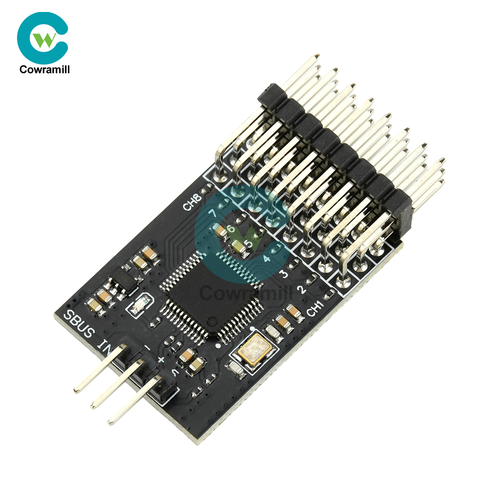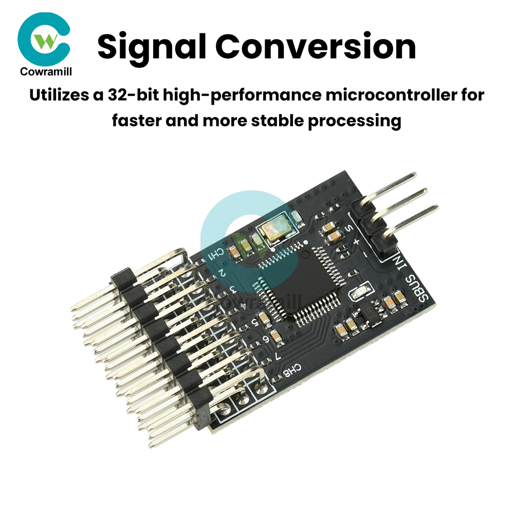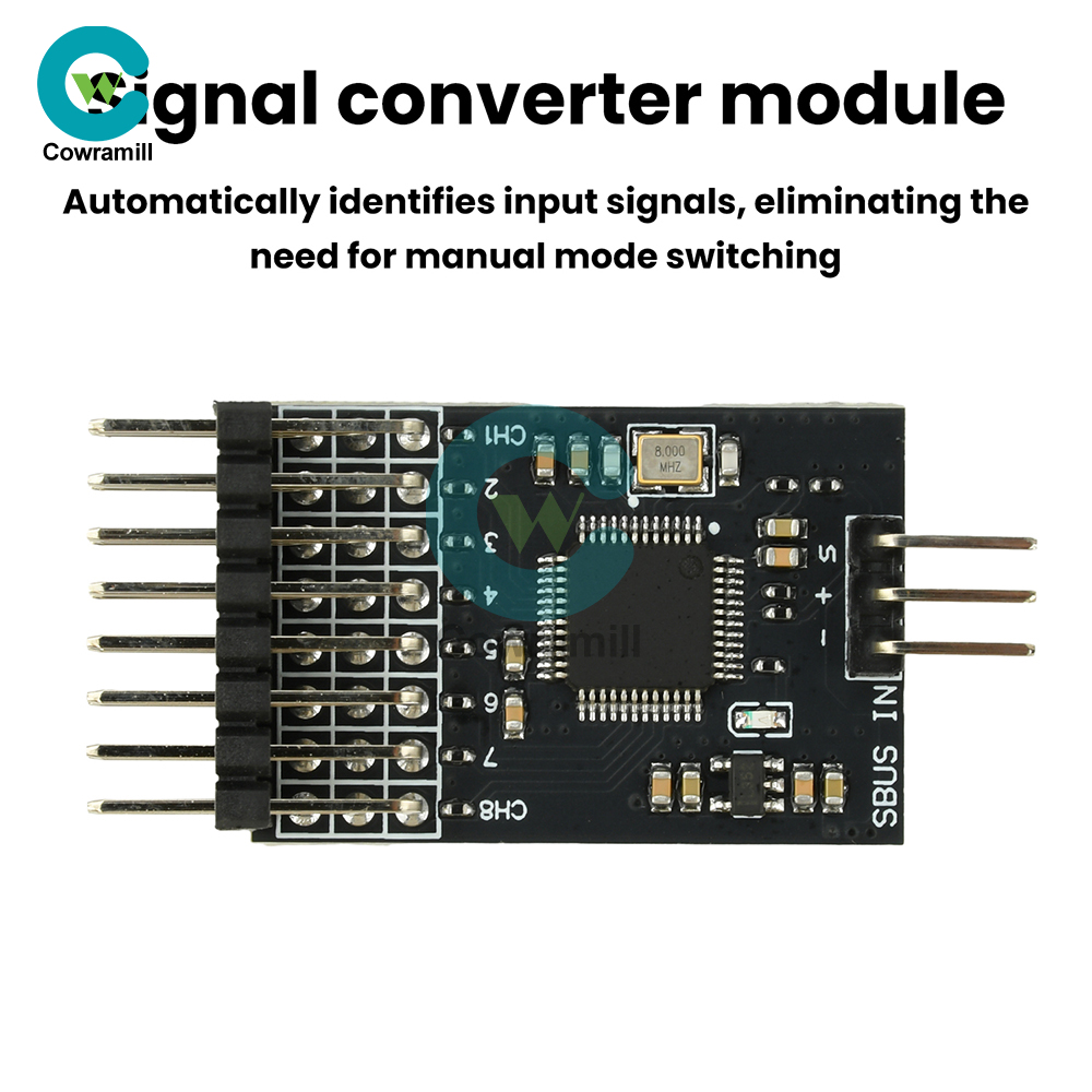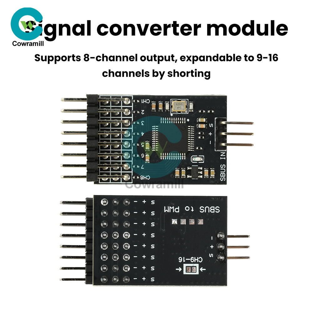 High-performance SBUS converter. This module features a wide voltage design supporting up to 16V input. Utilizing a 32-bit microcontroller for signal acquisition, processing, and conversion, it delivers stability and speed far exceeding standard 8-bit microcontrollers. Input signals are automatically recognized without manual switching, offering plug-and-play functionality. Status indicators are clear and concise, supporting 8-channel input/output.