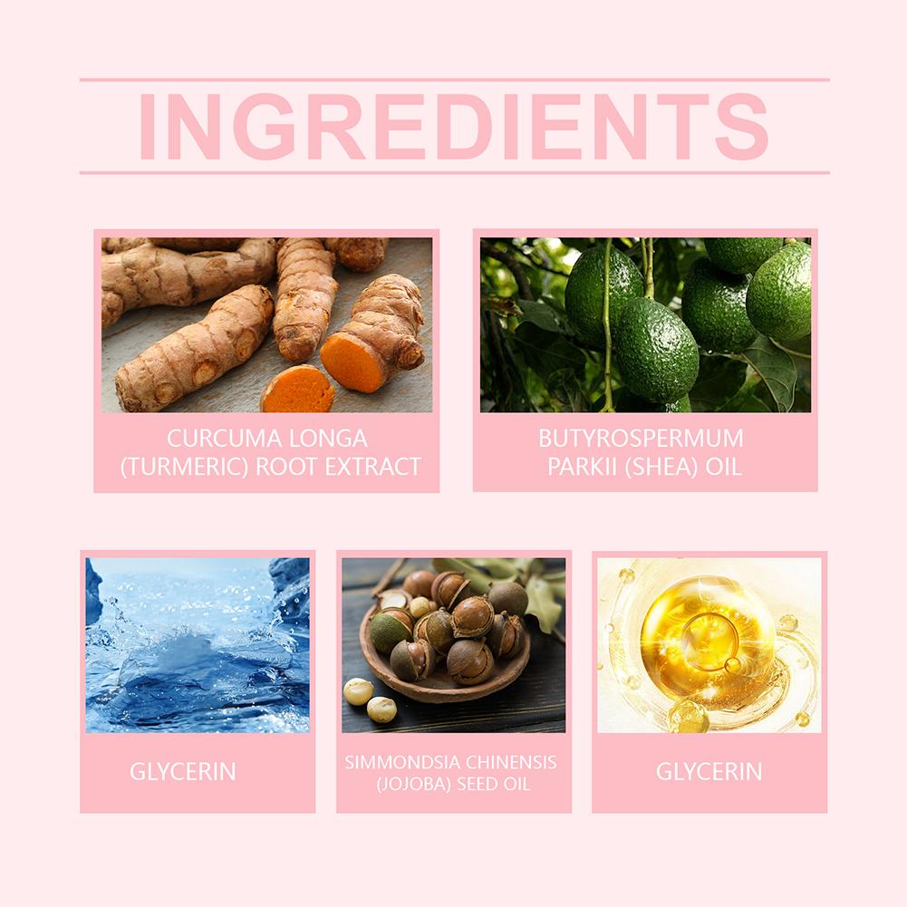 1. Natural turmeric essence: Selected high-quality turmeric root extract as the core ingredient, turmeric is rich in antioxidants, which can effectively fight skin free radicals, help lighten spots, even out skin tone, and make the skin glow with natural luster.