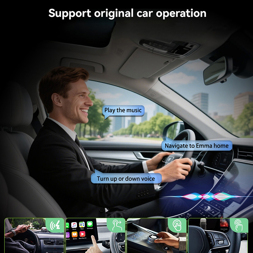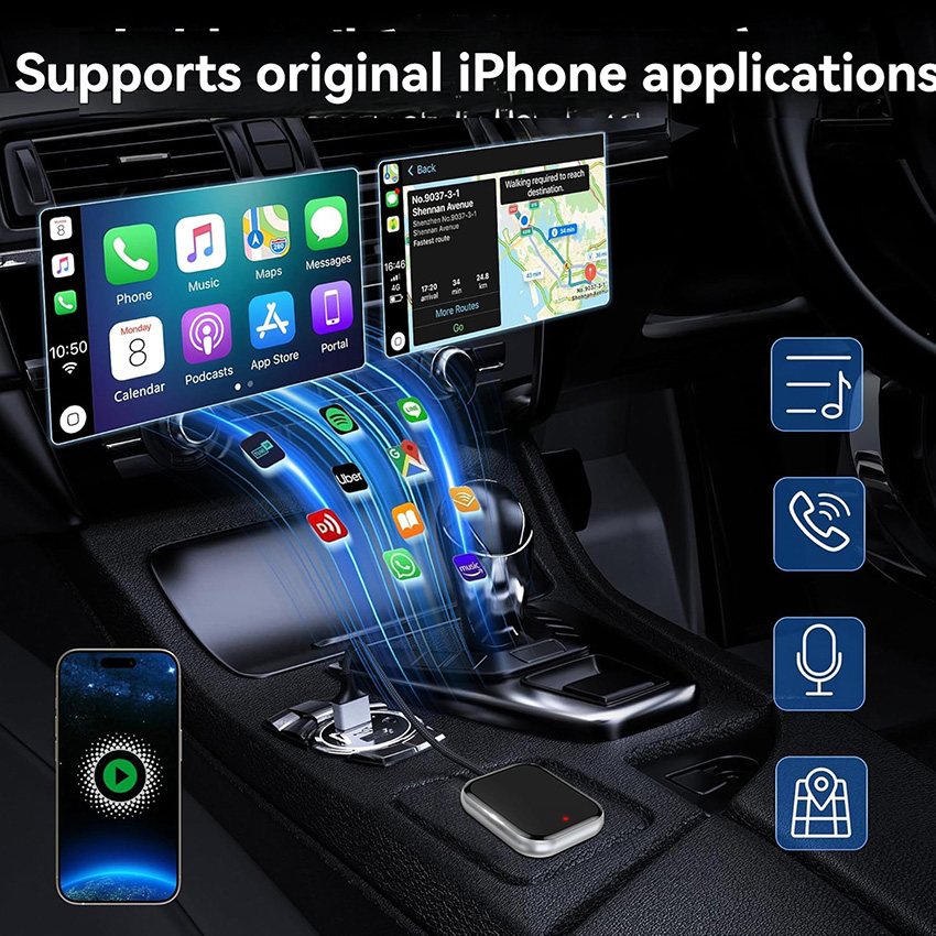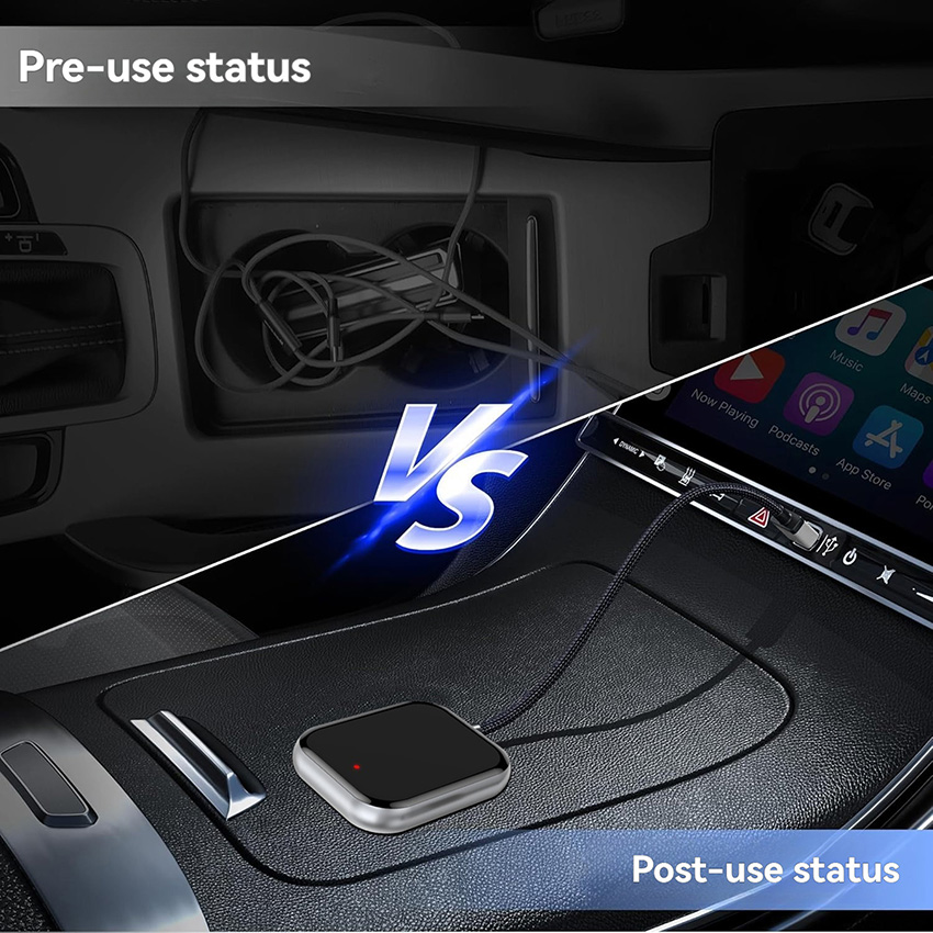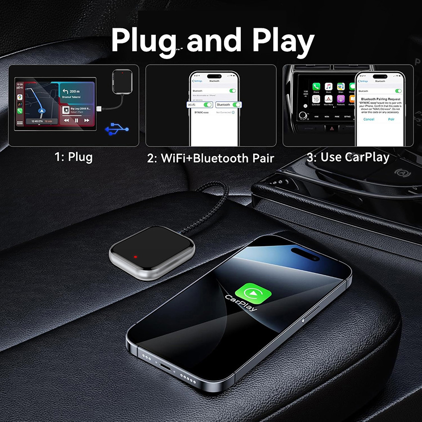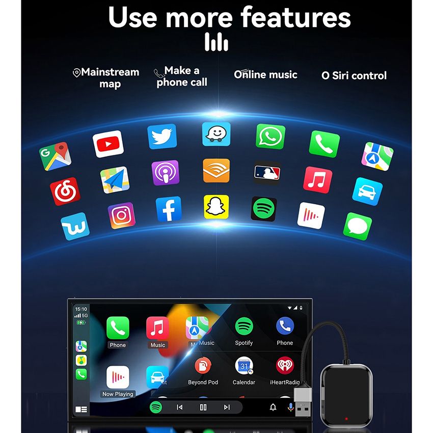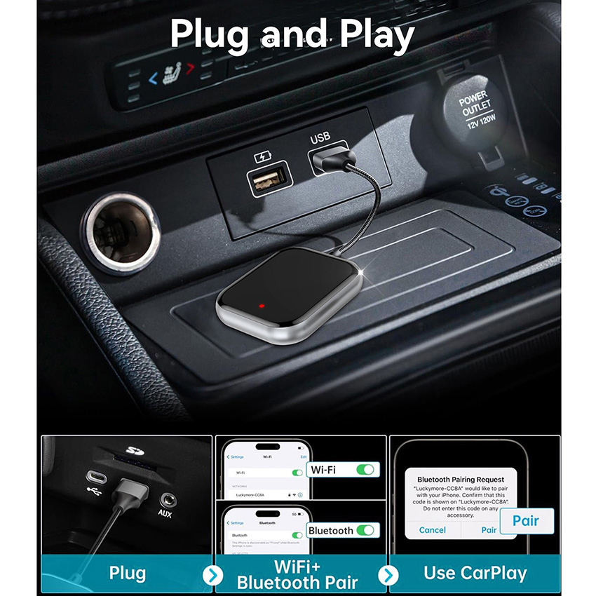 l Connect the product's USB-A port to the USB hub with a data interface inside the car to power the product and connect it to the car's display screen. Then, search for the product's Bluetooth name using an iPhone to pair it. Make sure Wi-Fi is turned on. Once pairing is successful, you can use the CarPlay feature