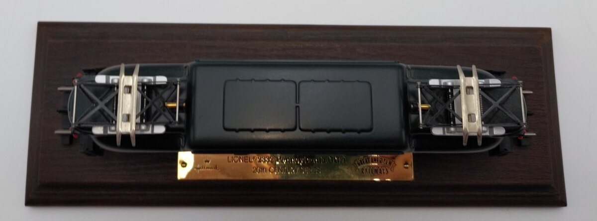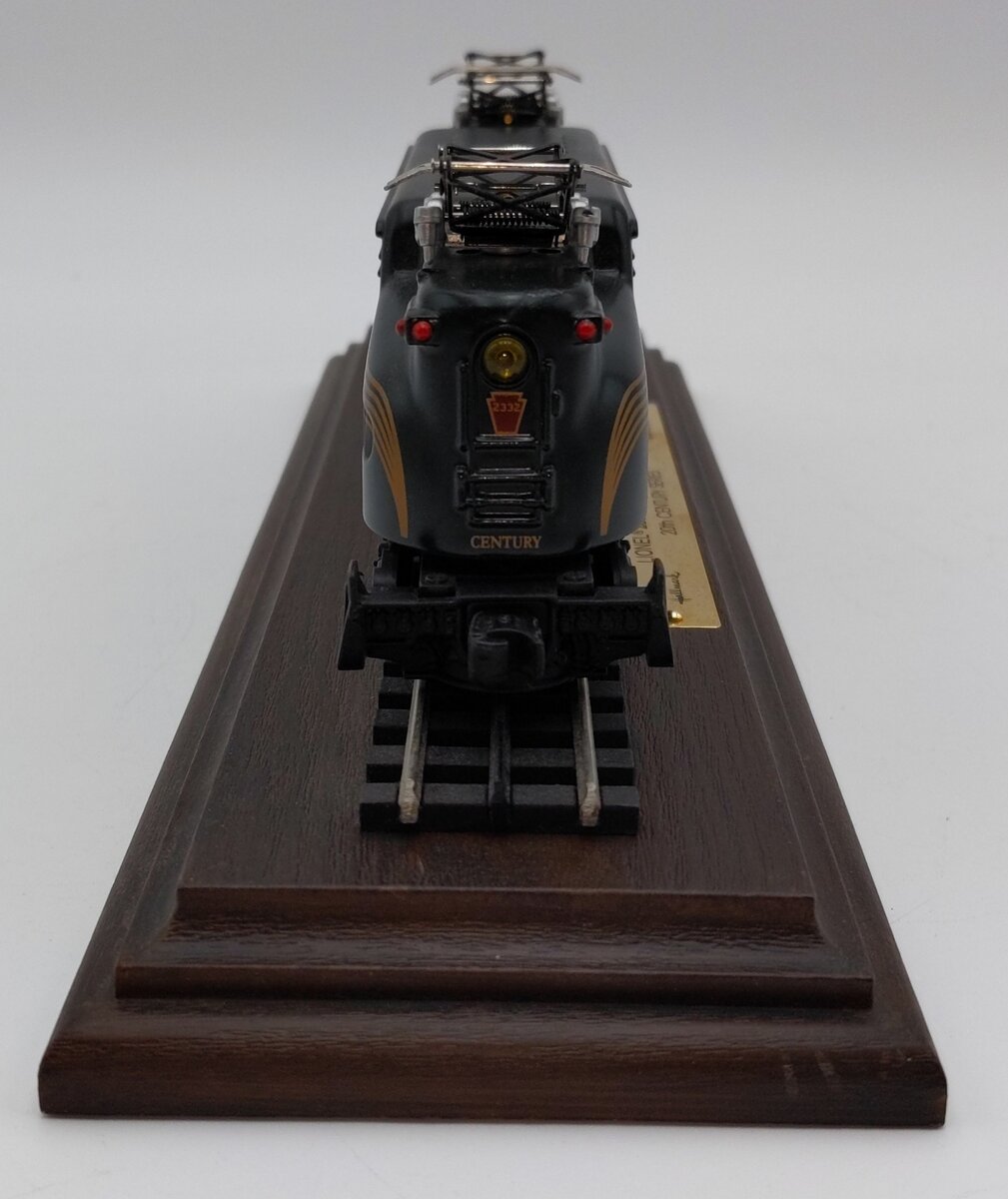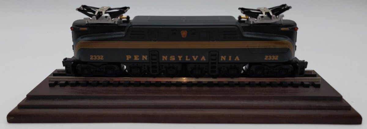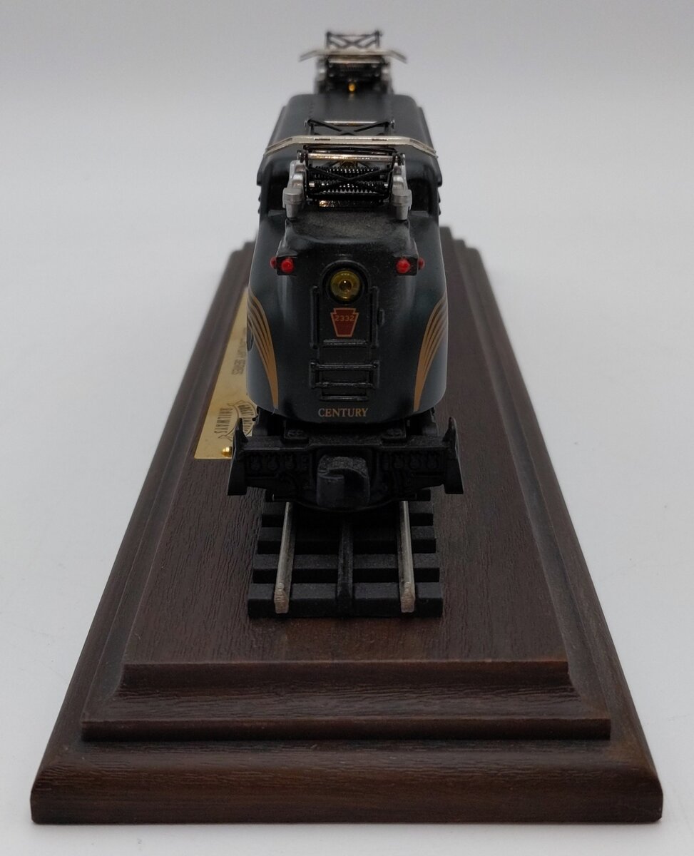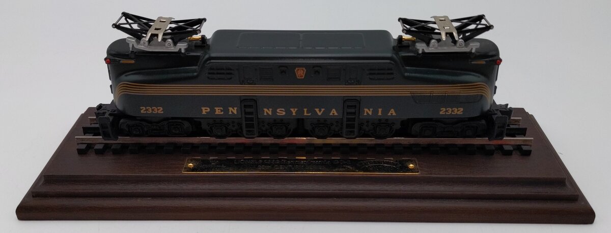 Here is a Hallmark Great American Railways Luxury Limited Edition Lionel 2332 Pennsylvania GG-1 Electric Locomotive w/Display Case. This locomotive feature die cast construction, pantographs, fixed couplers, die cast trucks, metal wheels. It features a wooden display base with a 9.5" section of track and an acrylic cover. The locomotive rolls up and down the track, but does not have a motor.