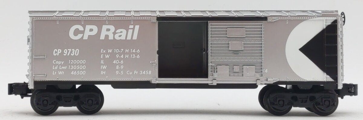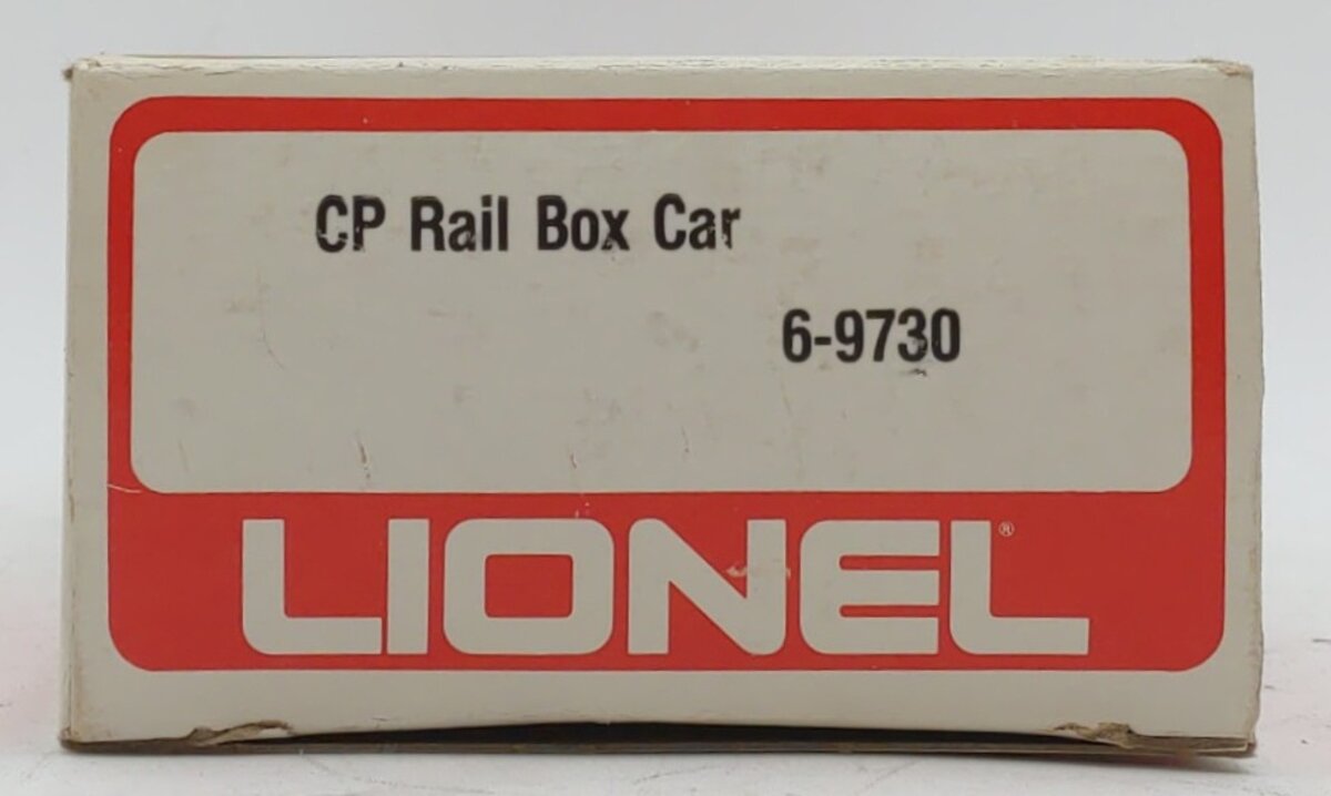 Here is a Lionel 6-9730 O Gauge CP Rail Boxcar - White Letter Version. This boxcar features sliding doors, plastic trucks, operating knuckle couplers, metal wheels and axles.