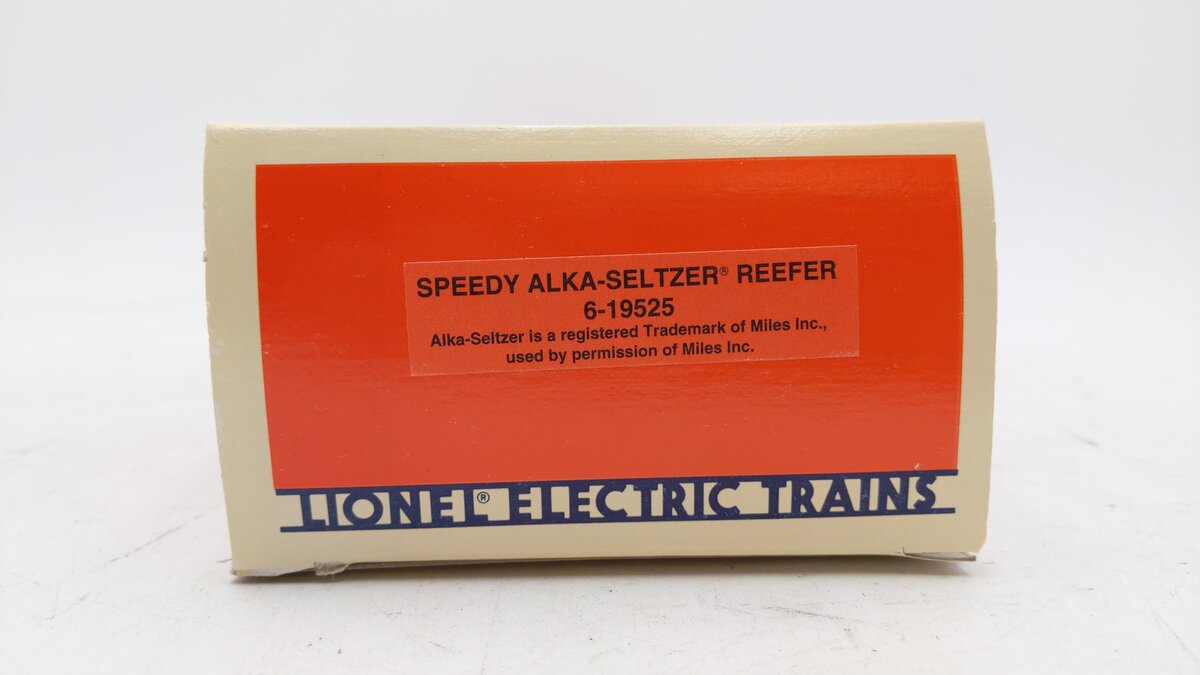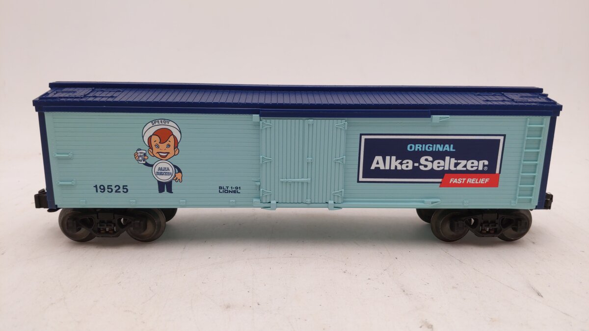 This is a Lionel 6-19525 O Gauge Speedy Alka-Seltzer Billboard Reefer. It Features: Die-cast sprung trucks, Die-cast operating knuckle couplers, Opening doors, Operating knuckle couplers, Metal chassis, Metal wheels and axles, Brake wheel, Length: 11-1/2 and Operates on O-27 or greater curves.
