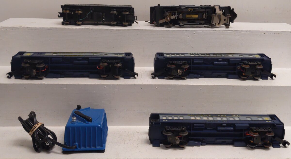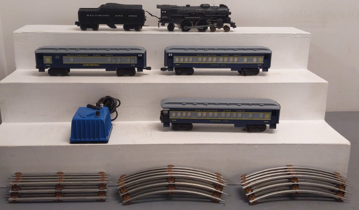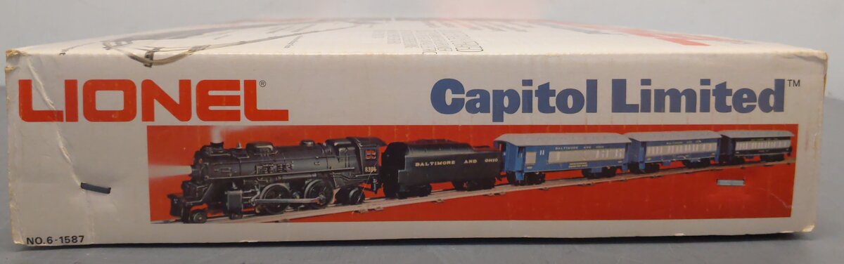 Here is a great Lionel 6-1587 O Gauge Capitol Limited Passenger Train Set from 1975. It is an 027 Gauge electric train set with die-cast steam engine featuring Mighty Sound of Steam working smoke and headlight plus illuminated passenger cars. The engine is the 8304 Baltimore and Ohio 4-4-2, and the cars are the 9517 Capital City Coach, 9518 National View Observation car, and the 9519 B&O Combination car. Also included is a transformer, 8 curved and 4 straight track sections that complete an oval layout.
