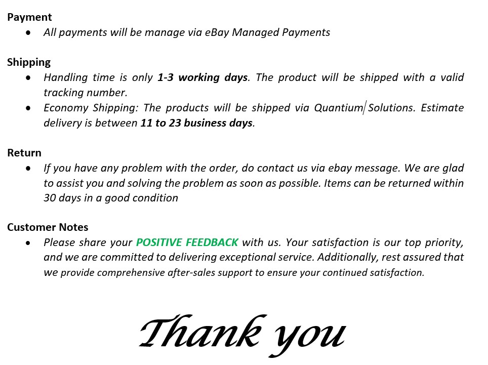 We can be contacted at any time through eBay messages if you have any questions, comments or product requests. We will respond to you within 24 hours and do our best to help you out! We encourage our customers to contact us with any questions or concerns! We'd like to be sure you are completely satisfied with your purchase.