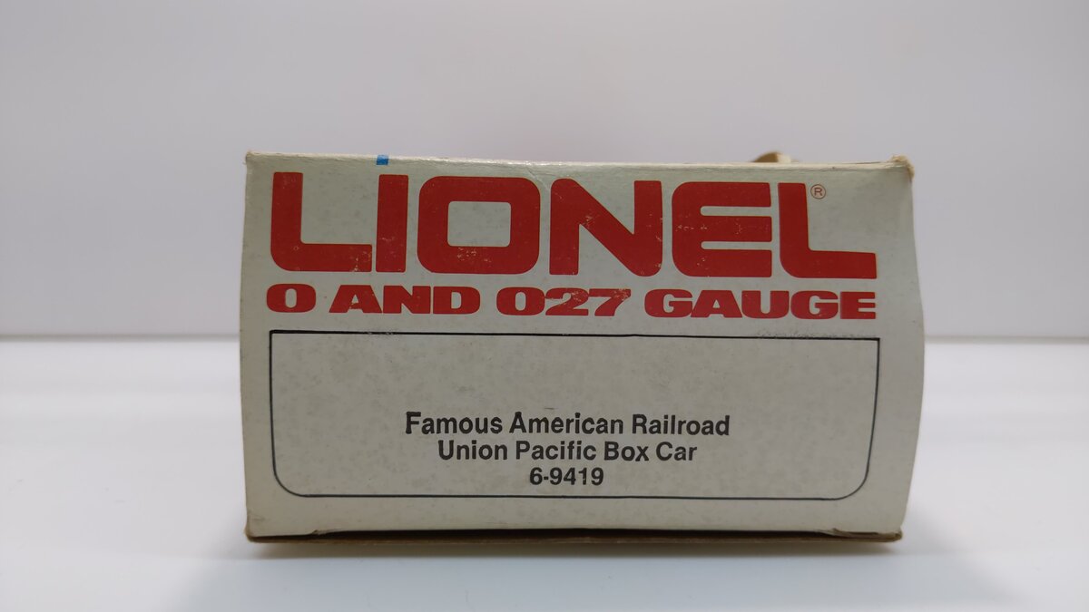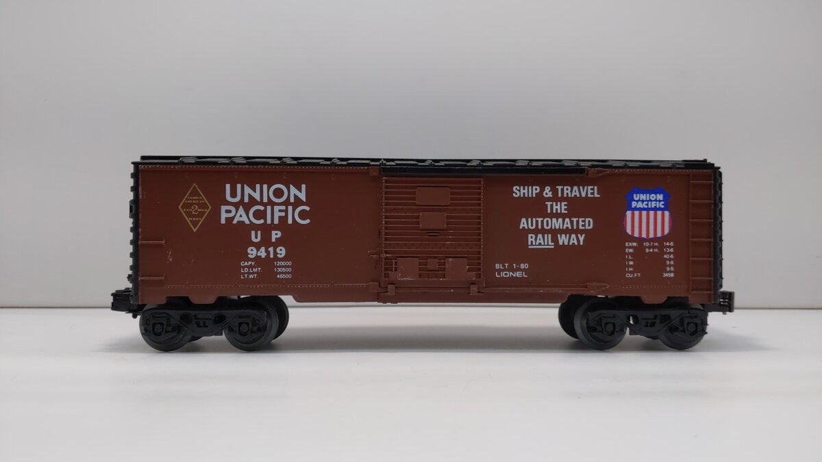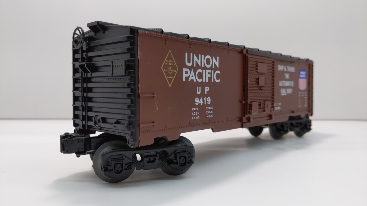 Here is a Lionel 6-9419 O Gauge Famous American Railroad Union Pacific Boxcar. This boxcar features sliding doors, plastic trucks, operating knuckle couplers, metal wheels and axles, and attractive molded details.