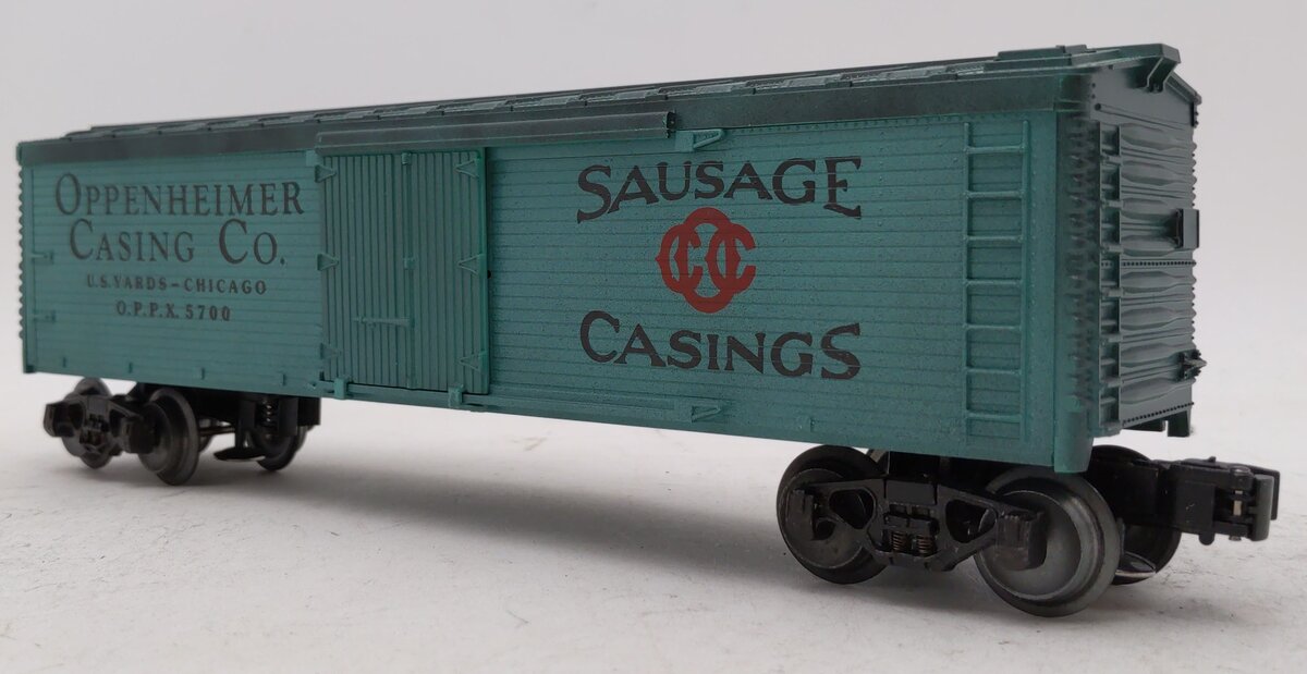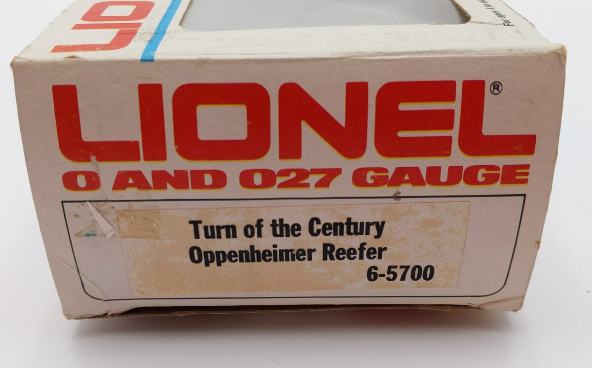 Here is a Lionel 6-5700 O Gauge Oppenheimer Woodside Reefer. This car features sliding doors, die-cast metal sprung trucks, die-cast metal operating knuckle couplers, and metal wheels and axles. If it appears a little weathered in the picture, that is because it is supposed to--the early 5700-series cars were the only cars ever given a weathered appearance by Lionel.