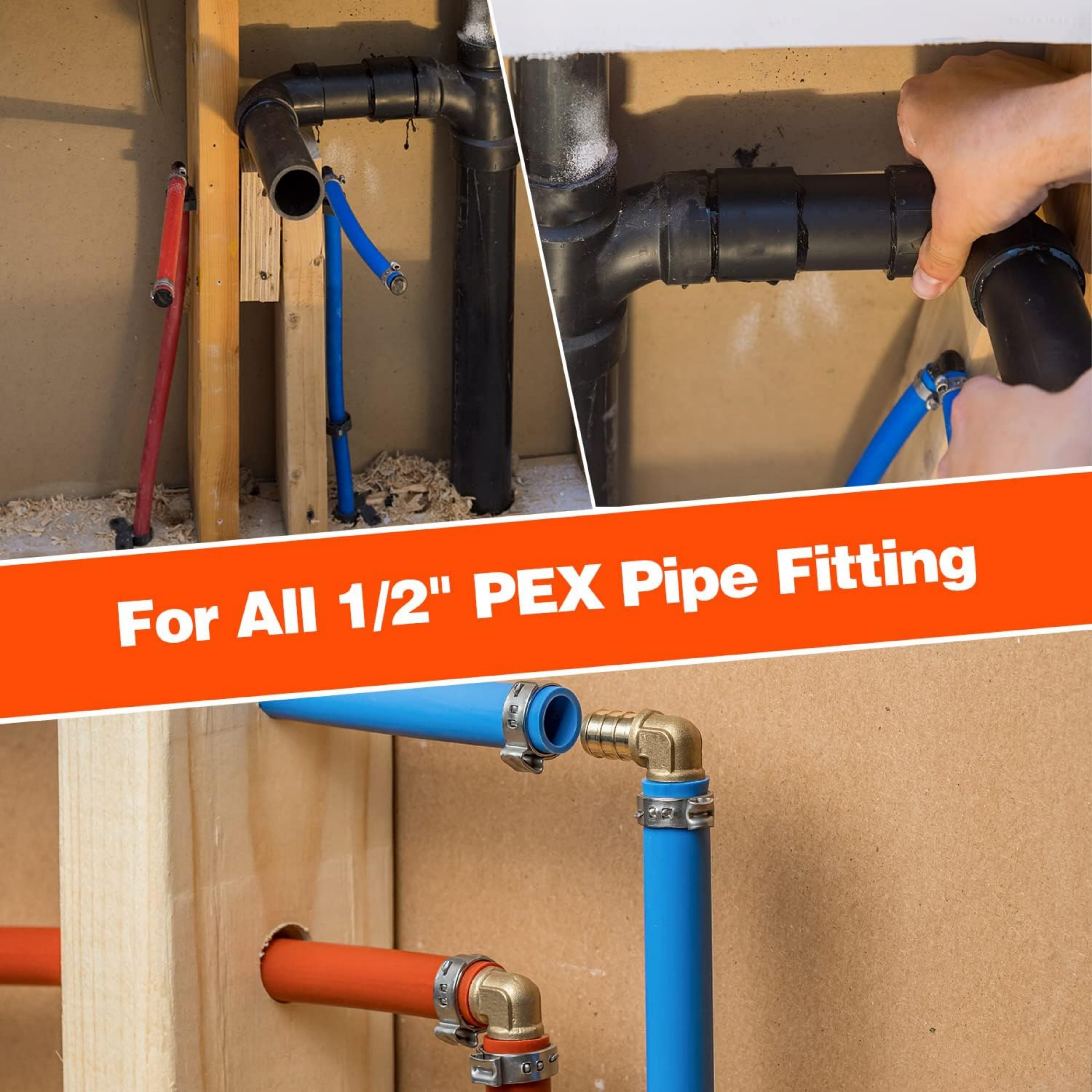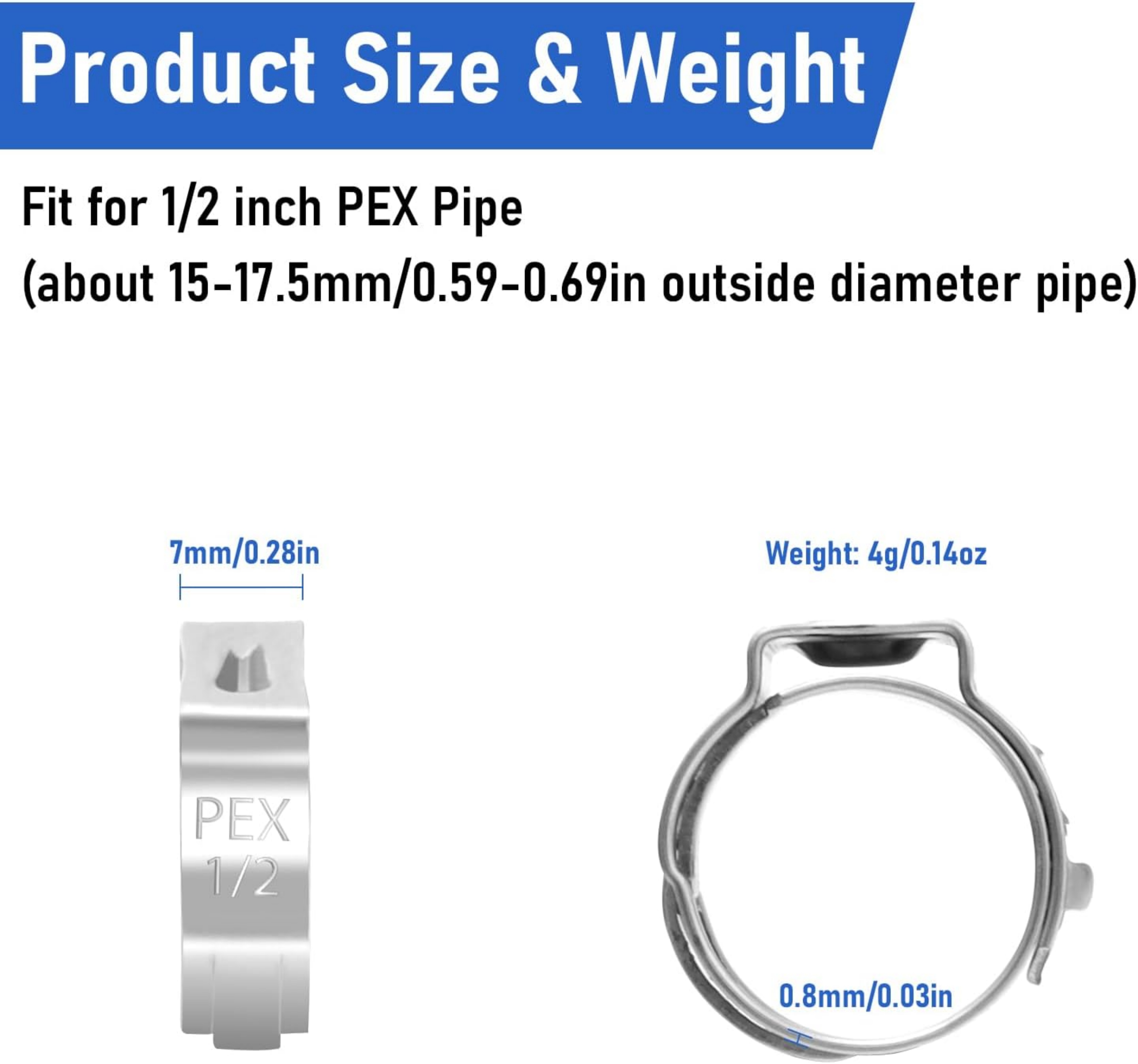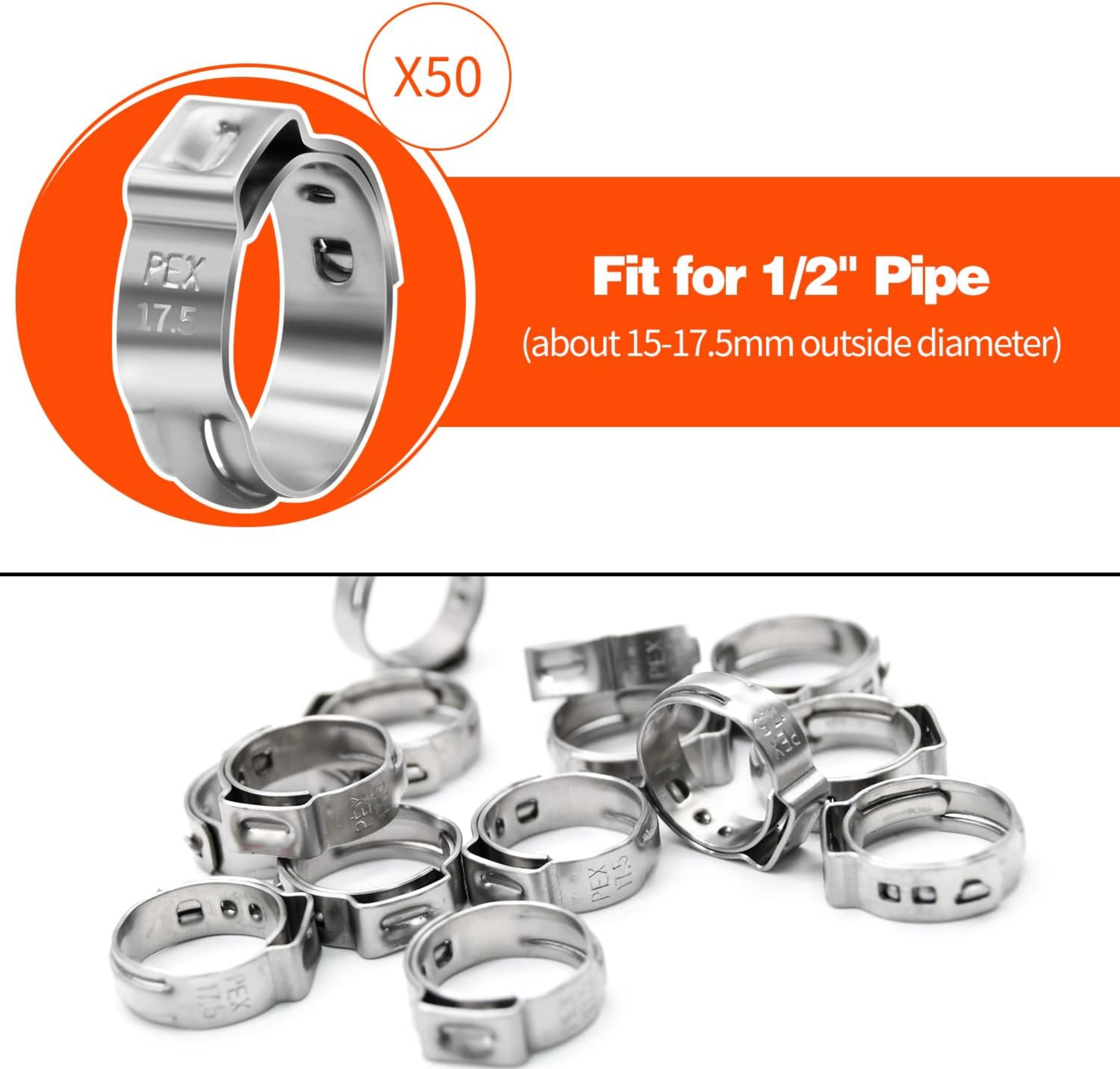 【50pcs PEX Clamps】- PEX cinch clamps set includes 50 pack 1/2" PEX cinch clamps, these 1/2" cinch clamps fit for 1/2 inch PEX pipes, they are widely used in plumbing systems.