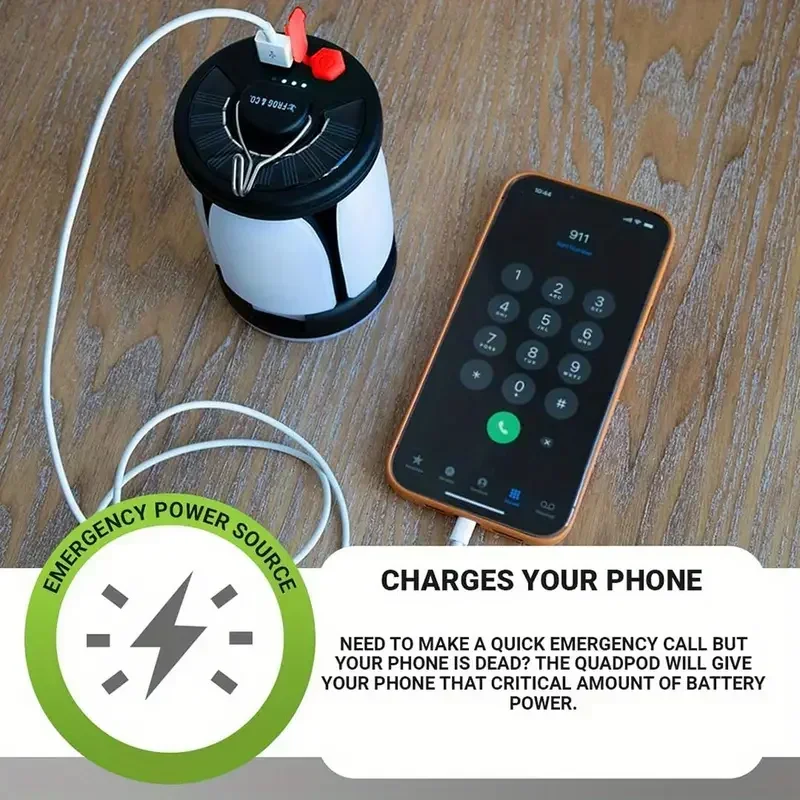 NEED TO MAKE A QUICK EMERGENCY CALL BUTYOUR PHONE IS DEAD? THE QUADPOD WILL GIVEYOUR PHONE THAT CRITICAL AMOUNT OF BATTERYPOWER.