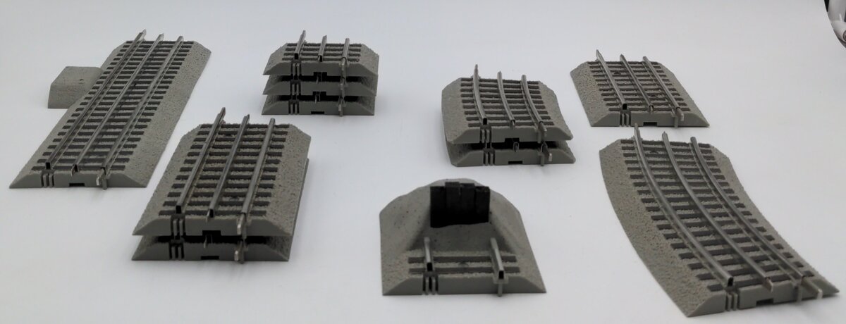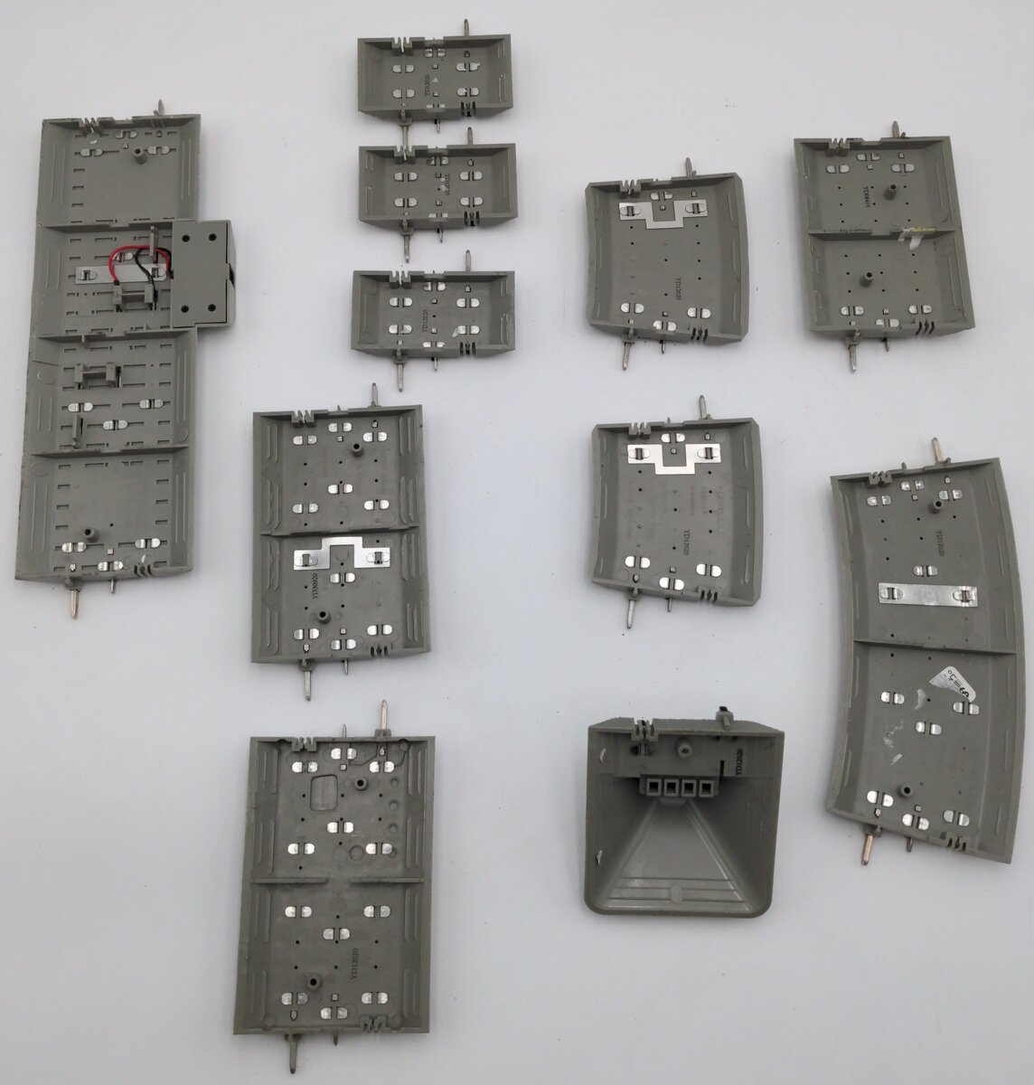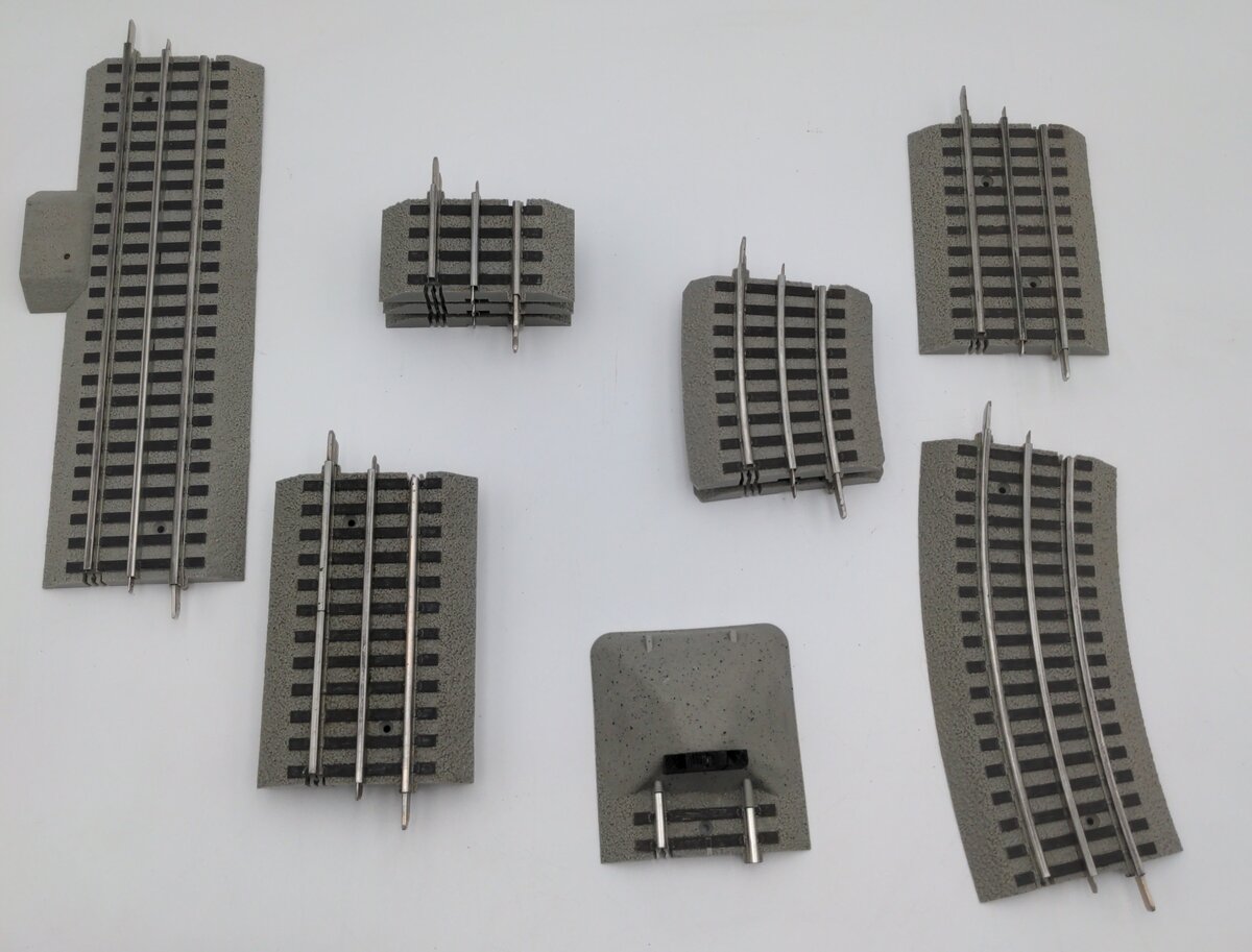Here are Lionel O Assorted FasTrack Sections: 6-12024, 6-12025, 6-12022, 6-120261 [11]. Includes: [2] 5" Straight, [1] 4.5" Straight, [1] O-36 1/2" Curve, [3] 1.75" Straight, [2] O-36 Quarter" Curve, [1] Earthen Bumper, [1] 10" Straight with power plug-in. Features include plastic roadbed construction and metal rails.