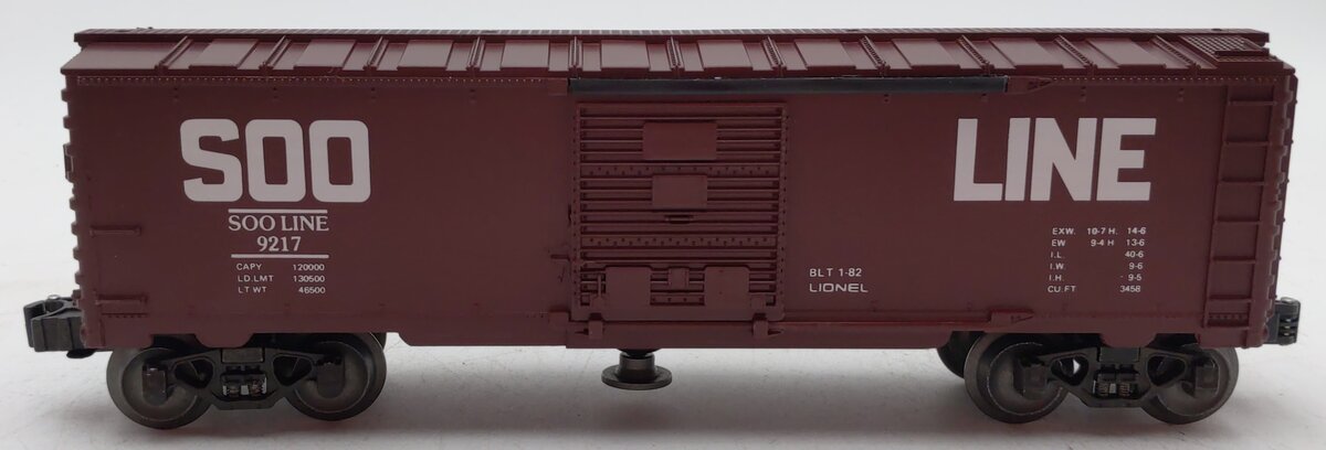 This is a Lionel 6-9217 O Gauge SOO Line Operating Boxcar from 1982-84.This boxcar features sliding doors, die-cast metal sprung trucks, die-cast metal operating knuckle couplers and metal wheels and axles.