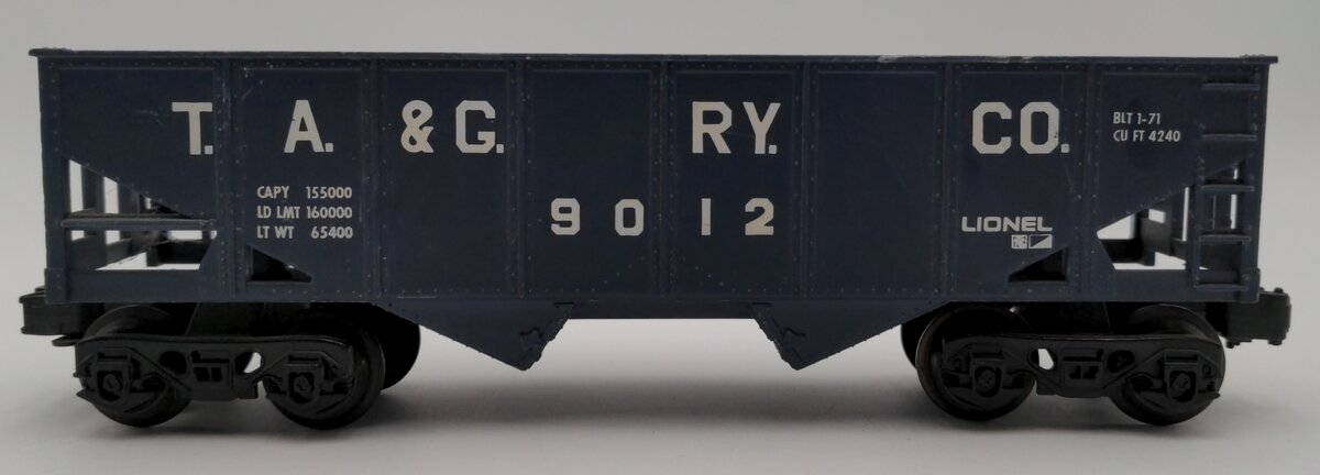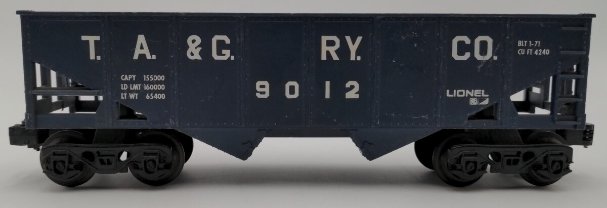 This is a Lionel 6-9012 O Gauge Tennessee Alabama & Georgia Blue 2-Bay Hopper from 1971-72. This hopper features plastic trucks, one operating knuckle coupler and one fixed knuckle coupler, metal wheels and axles. This car is a modern rerun.