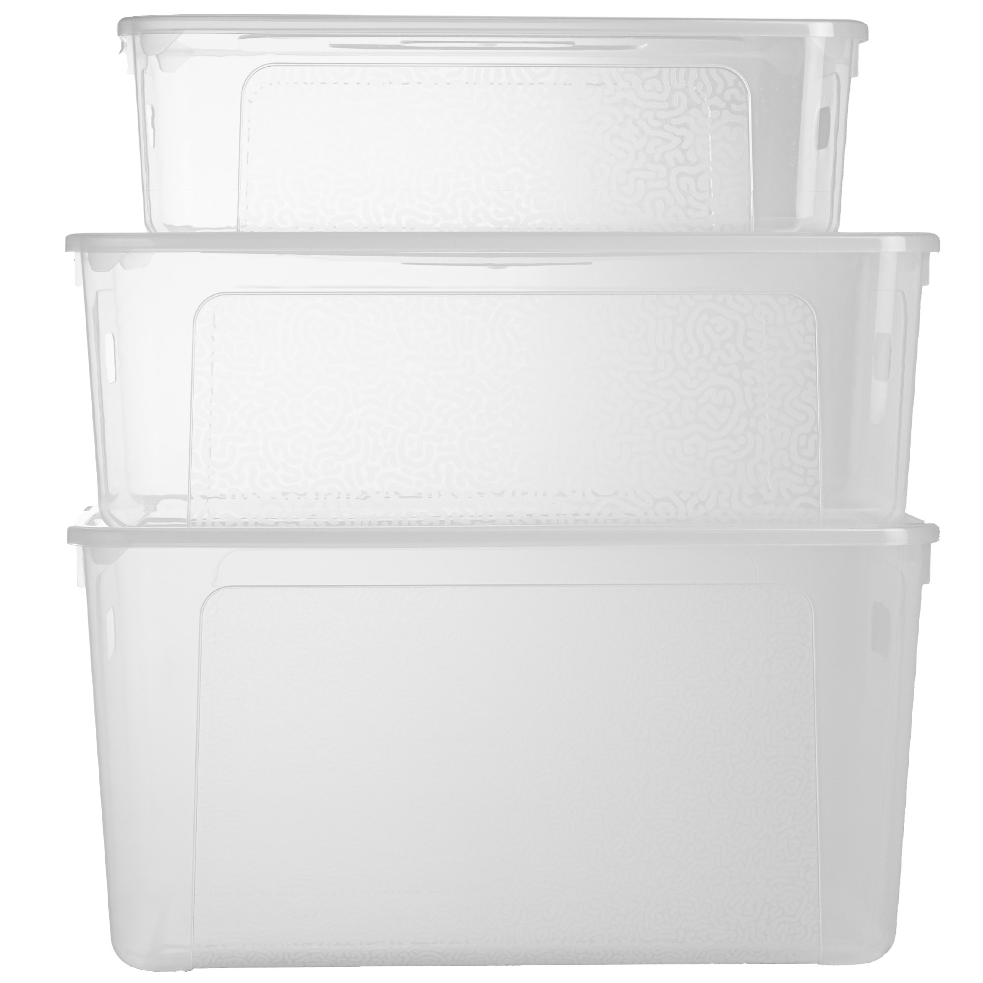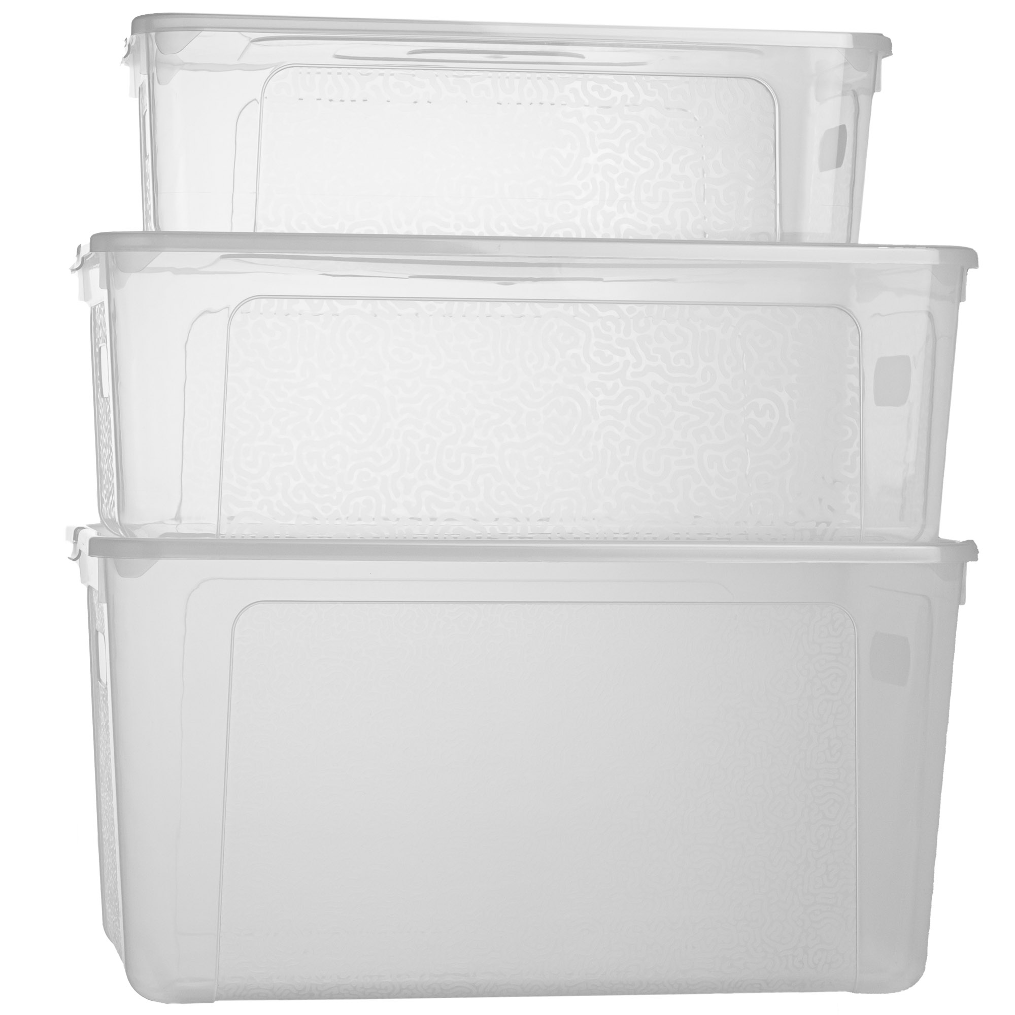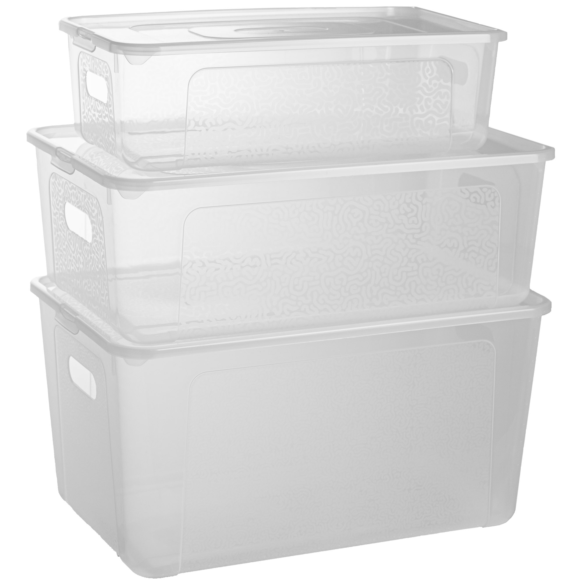 Un ensemble de trois récipients en plastique La Mutibox est le moyen idéal de mettre de l'ordre dans votre maison. A partir de maintenant Les choses ont leur propre place et vous gagnez le temps que vous cherchez dans les différents coins et angles. Les conteneurs sont en plastique durable et de haute qualité fabriqué. Ils ont une couleur transparente et un motif fin. Ainsi, vous pouvez voir immédiatement ce qu'il y a dedans.